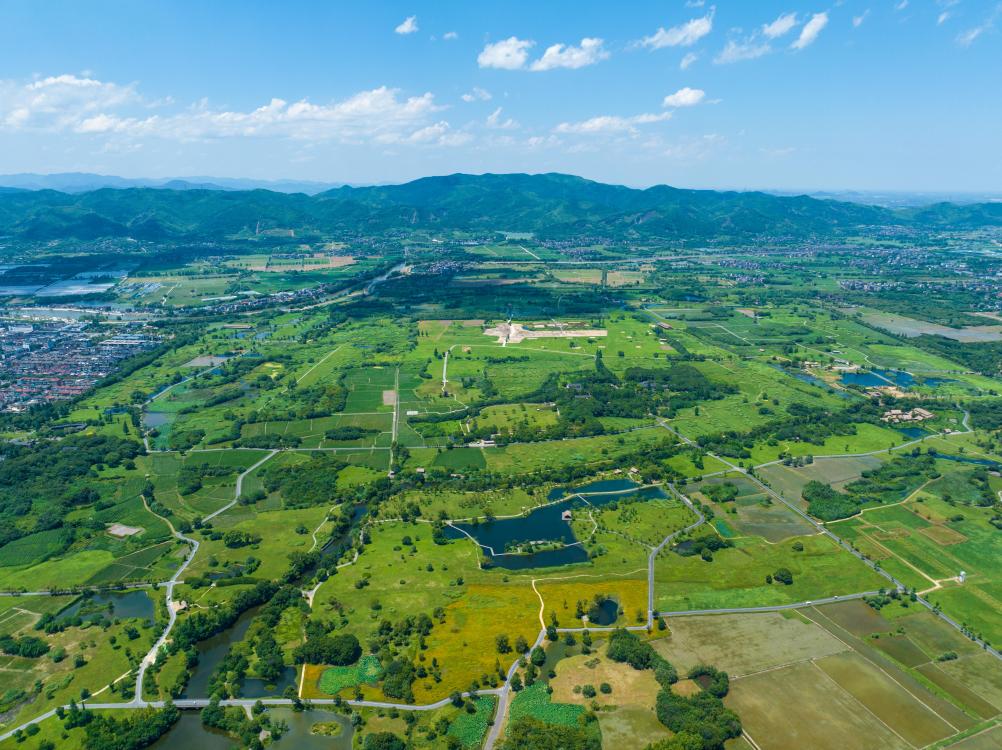 ?這是2024年7月4日拍攝的杭州良渚古城遺址公園全景(無人機照片)。新華社記者 江漢 攝