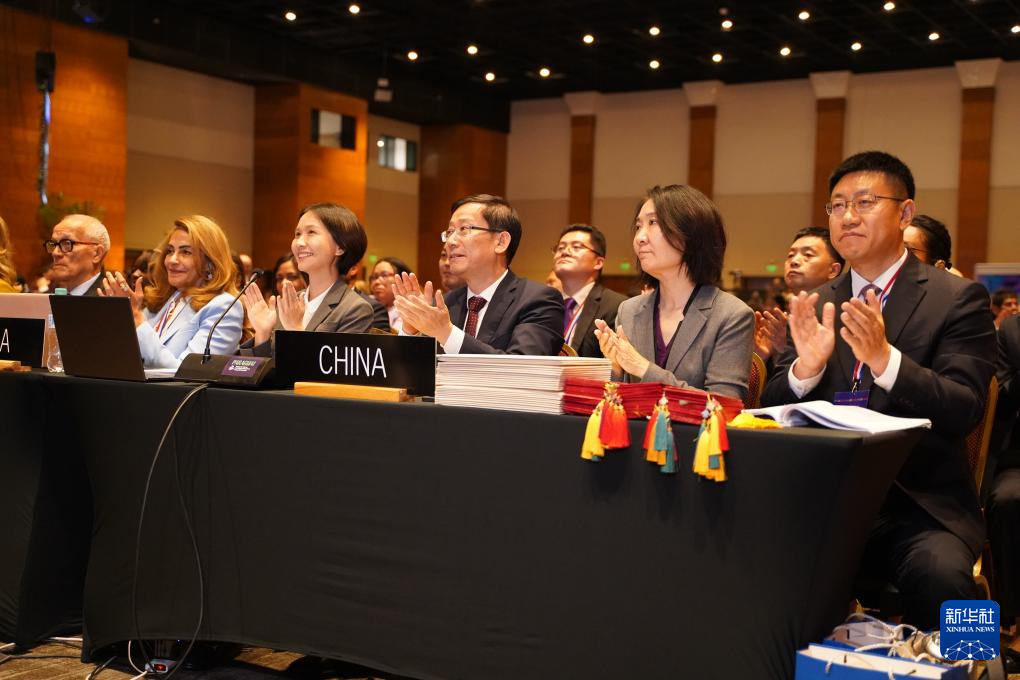 12月4日,在巴拉圭亞松森拍攝的聯合國教科文組織保護非物質文化遺產政府間委員會第19屆常會評審現場,中國代表團慶祝春節申遺成功。新華社記者 朱雨博 攝