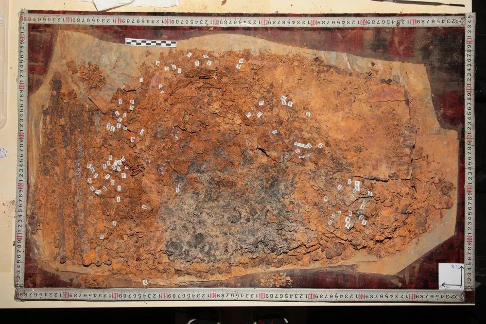 江西省文物考古研究院研究員、?;韬钅箍脊虐l掘領隊楊軍介紹,這批甲片被發現于劉賀墓西藏槨武器庫,與刀劍伴隨出土,據現場漆皮痕跡推測,當時被裝在漆箱中。出土時漆箱已腐爛,鎧甲、刀劍呈堆砌狀,“?;韬钅瓜群蠼洑v地震、鄱陽湖水南侵造成的地下水位上升,埋藏環境導致甲片質地輕薄脆弱,我們決定對文物進行整體套箱提取,再通過實驗室考古進行保護研究”。