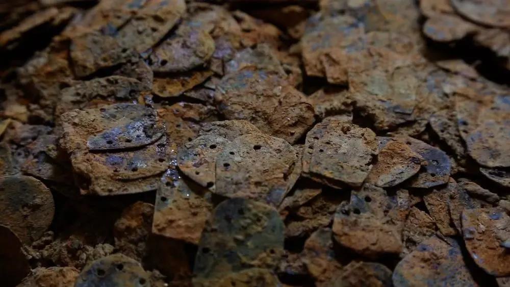 來自中國社會科學院考古研究所、科技考古與文化遺產保護重點實驗室和江西省文物考古研究院等機構的文保人員,經過兩年多時間從套箱中提取了約6000片甲片。文保人員經初步復原研究認為,劉賀墓出土的鎧甲為鐵漆、銅漆、皮漆復合材質編綴的魚鱗甲。