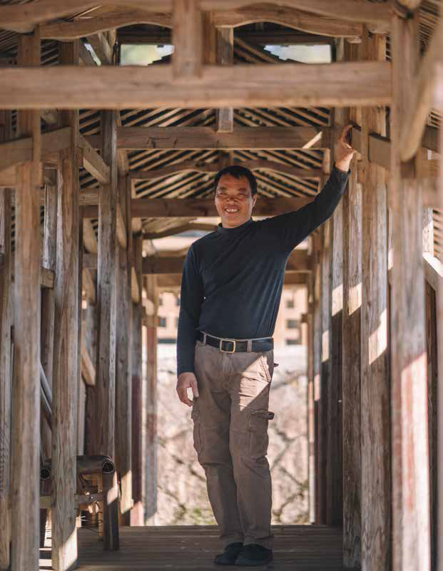 而最為遺憾的是,泰福廊橋的廊屋是修在石跨梁上的,并非懸空而架的木架梁。他為沒能親手體驗搭建木廊橋的跨梁而耿耿于懷。