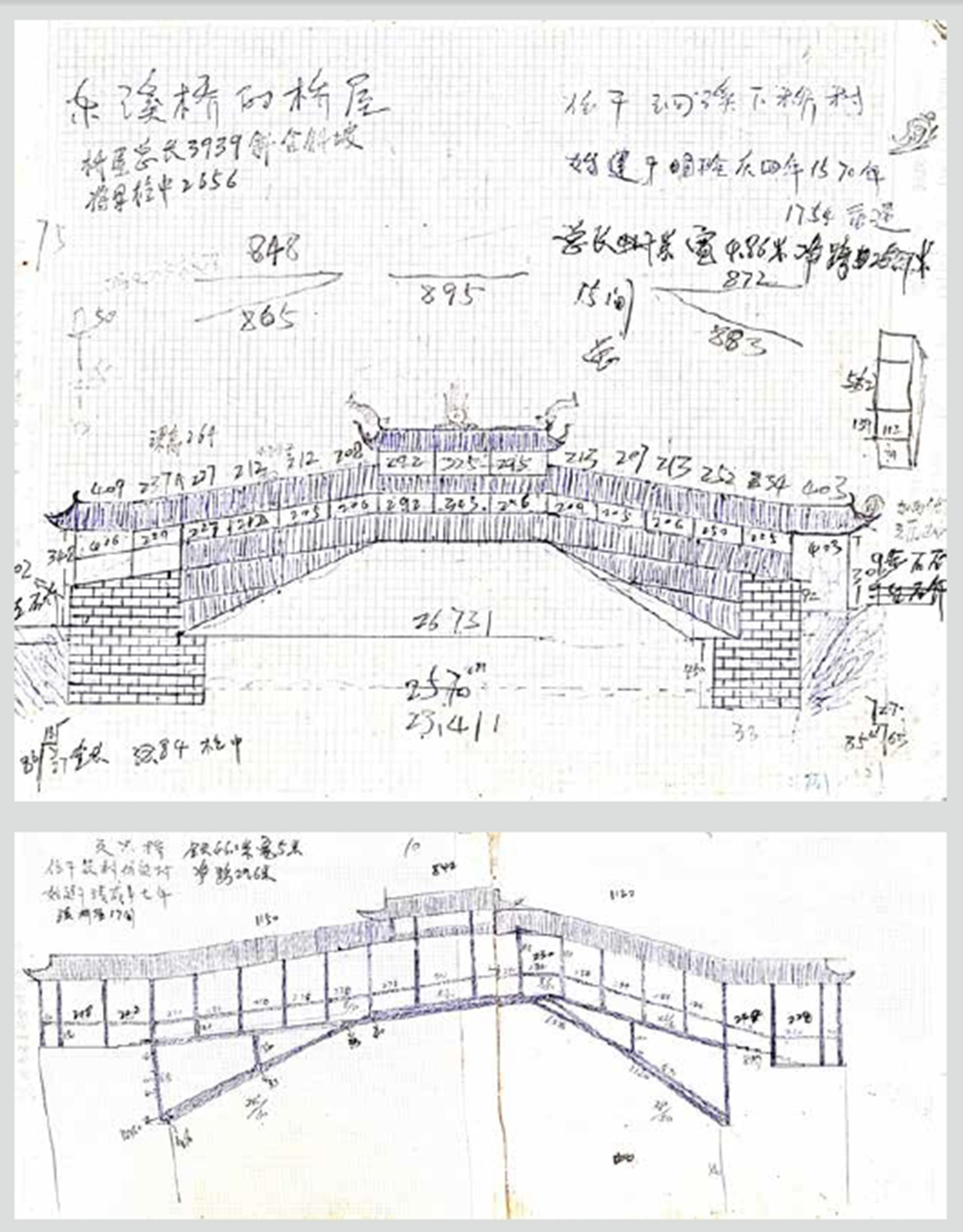 傳統藝人不會繪圖,而今繪圖的人不會動手建造,但曾家快打通了兩頭。20多年前,他一個人跑遍泰順所有國保廊橋,親自測繪每座廊橋的數據。2016年,莫蘭蒂臺風沖毀了其中三座,借助他的測繪圖,三座廊橋重新屹立河上。繪圖/曾家快