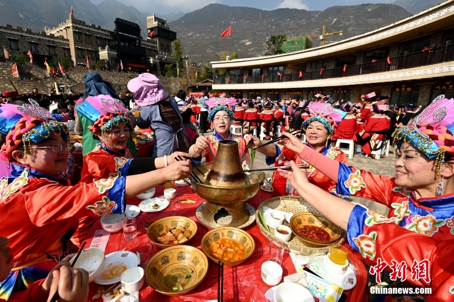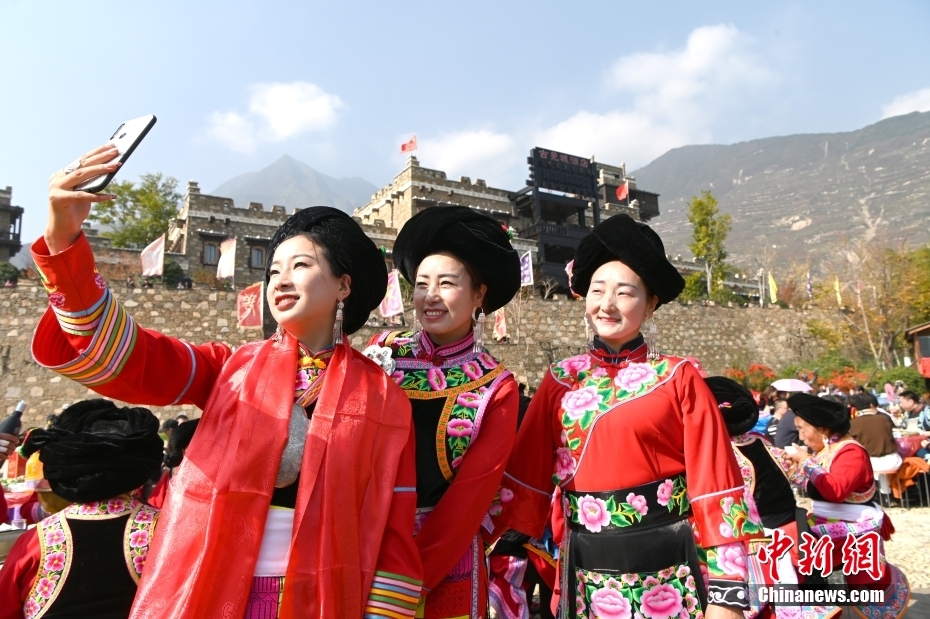 羌歷新年,四川茂縣在古羌城薩朗廣場上舉辦壩壩宴,與八方游客共慶羌族新年。圖為羌族民眾在壩壩宴上自拍留念。