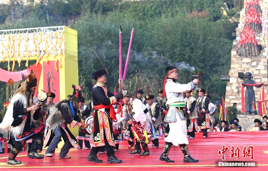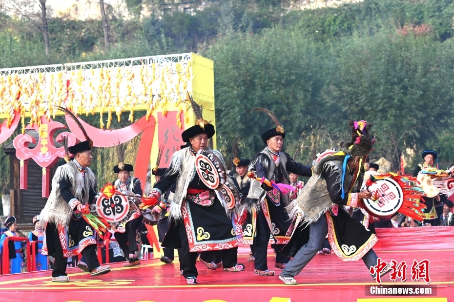 農歷十月初一是傳統的羌歷新年,第七屆四川省國家級羌族文化生態保護區成果展暨2024羌年慶?;顒釉诎沃菝h舉行。圖為慶?;顒由系恼寡?。