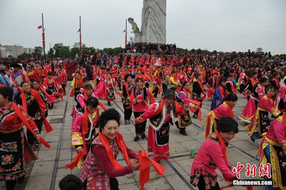 2013年11月3日是農歷十月初一是羌族一年一度的“羌年”,也迎來了四川省北川羌族自治縣成立十周年。北川上萬民眾跳起歡快的沙朗,創下規模最大的沙朗舞吉尼斯世界紀錄。圖為能歌善舞的羌族同胞齊跳沙朗。
