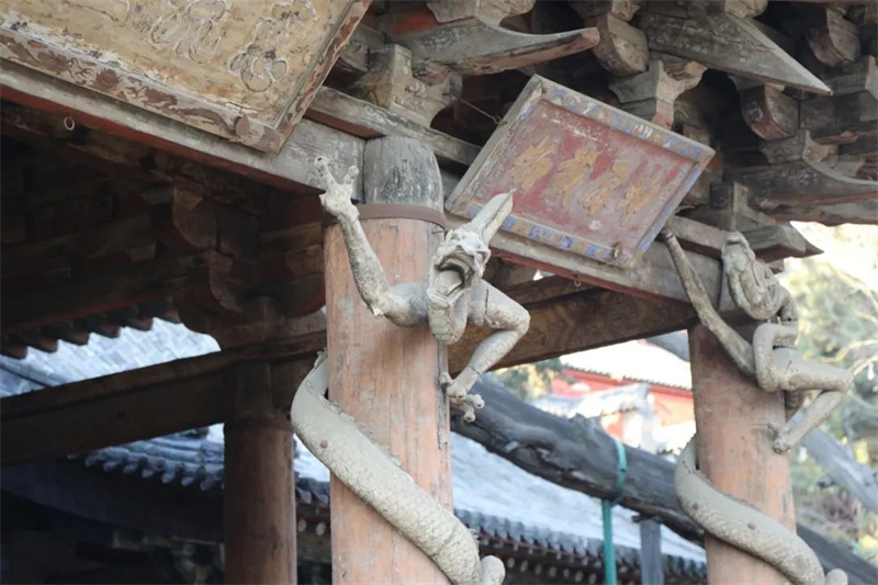 圣母殿前的木雕盤龍,成為游客新寵。在驚嘆古人巧奪天工的同時,很多人被北向第二條龍成功“萌化”,只見它身子前傾,右爪伸出,仿佛“比耶”。新的流量密碼get,冰箱貼、小掛件統統安排,“比耶龍”成為新晉網紅。