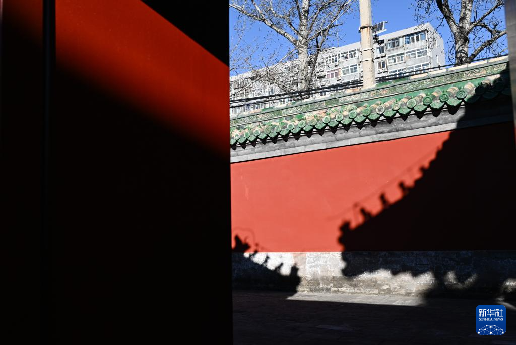 12月21日冬至日,陽光在紅墻上照射出慶成宮屋頂和脊獸的影子。新華社記者 陳鐘昊 攝