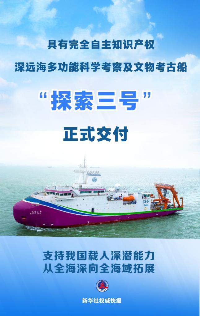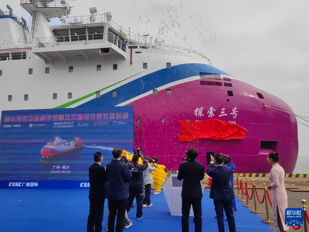 新華社廣州12月26日電(記者田建川、張泉)深遠海多功能科學考察及文物考古船“探索三號”26日在廣州南沙交付。此船具備完全自主知識產權,是我國首艘具備全球(含極區)深遠海探測和冰區載人深潛支持能力的綜合科考船。