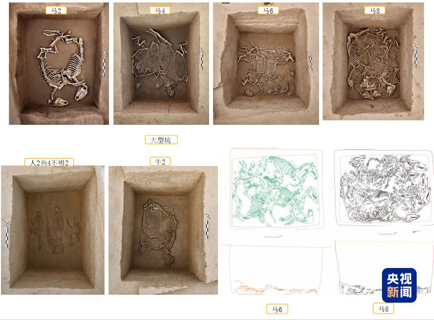 在王陵區西圍溝內探出大型墓葬2座,其中一座帶一條墓道;鉆探確認王陵區一帶西周早期遺址的面積超過8萬平方米,這是殷墟范圍內發現的最大的西周早期聚落。在商王陵區西圍溝東面發掘祭祀坑48座,祭祀坑分大、中、小三類,以大型為主,通過發掘確認可分為6排,多殉葬馬,此外還有人、牛、狗、豬、象、鳥等。