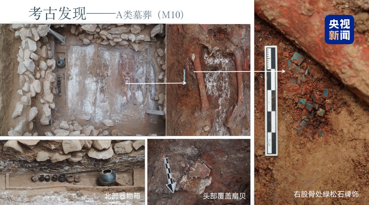 這些墓葬集中分布、排列有序,出土陶器、漆木器等50余件(套)。其中,M10規模最大,長、寬均超過6米,墓室面積達46平方米。墓室為豎穴土坑,有熟土二層臺,內用石塊構筑大型石槨,長寬均達4米,石槨內置木槨,木槨內并列放置三個木棺,棺內各葬一人。中棺內為男性,身體涂朱,頭頂覆有扇貝,左側股骨下隨葬綠松石嵌片牌飾,具有明顯的二里頭文化因素。