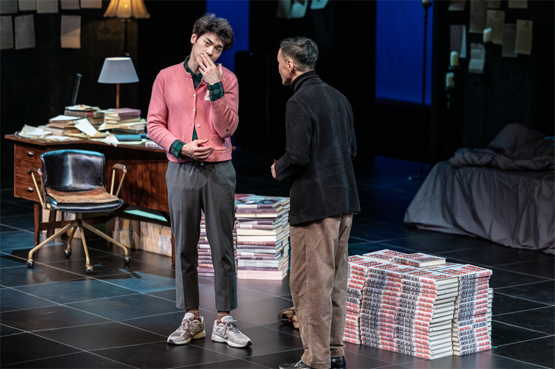 該劇的舞臺美術設計也別具一格,觀眾們如同全體置身于主人公諾克的居所中——一座封閉靜謐的海島上唯一的建筑物。完全開放的洗手間,清冷的光線,營造出一種離群索居的氛圍;隨處可見的手稿,堆疊的書籍,壁爐里燃燒的火苗和臺燈渲染出的氣氛,又在疏離中構建了一絲暖意??季康募毠澨幪幟枥L出人物的生活狀態,反應出劇中人內心世界。就連劇中人物的服裝也暗藏玄機,不僅代表著人物的身份,也暗示出人物內心不同的角色,這些設計都將會帶給觀眾足夠的線索,一起去劇中探秘。