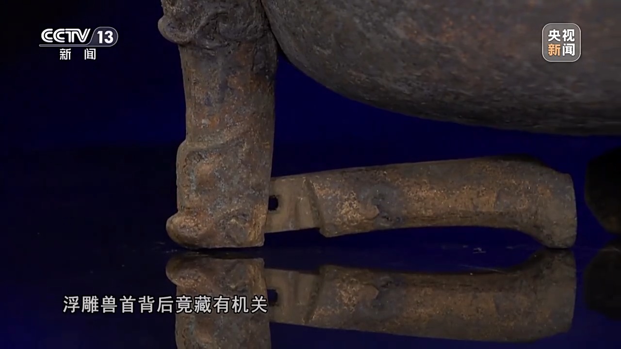 武王墩墓的五件青銅甗,造型紋飾素淡簡約,屬于戰國晚期普遍風格,仔細探查,其中一只卻大有玄機,奧秘就在它的立足中肘,浮雕獸首背后竟藏有機關,可使三足折疊90度,整尊甗似瑞獸由立變臥,儀態觀感立時不同。這種折疊設計,在今天看來何其普通,但在久遠的青銅時代,卻極為罕見,對材質工藝都要求甚高。