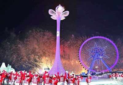 在《冰雪的亞細亞》的歡快樂曲聲中,來自34個國家和地區的體育代表團相繼入場,受到全場觀眾的熱情歡迎。哈爾濱,這座“冰雪之城”,用熱情撰寫了一部熱氣騰騰的迎賓志。