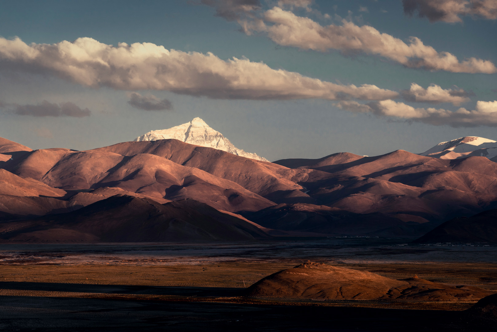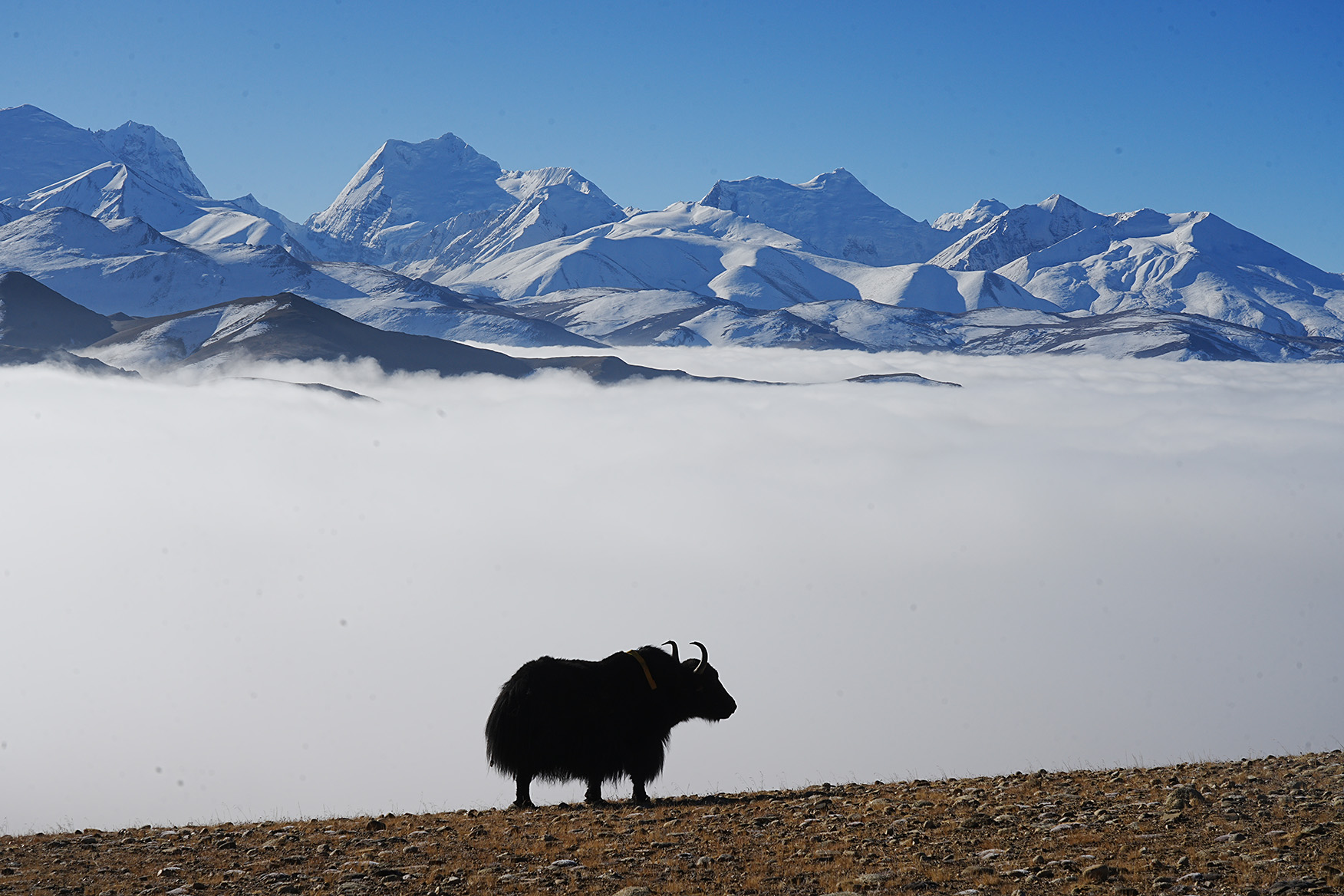 在那遙遠的天際,雪山巍峨聳立,守護著這片廣袤的大地。潔白的雪覆蓋著山峰,在陽光的照耀下,閃耀著神秘而迷人的光芒。山腳下,土地延綿不絕,醇厚的色彩仿佛承載著歲月的沉淀。牦牛在山腳下悠閑地漫步,與周圍的美景融為一體。