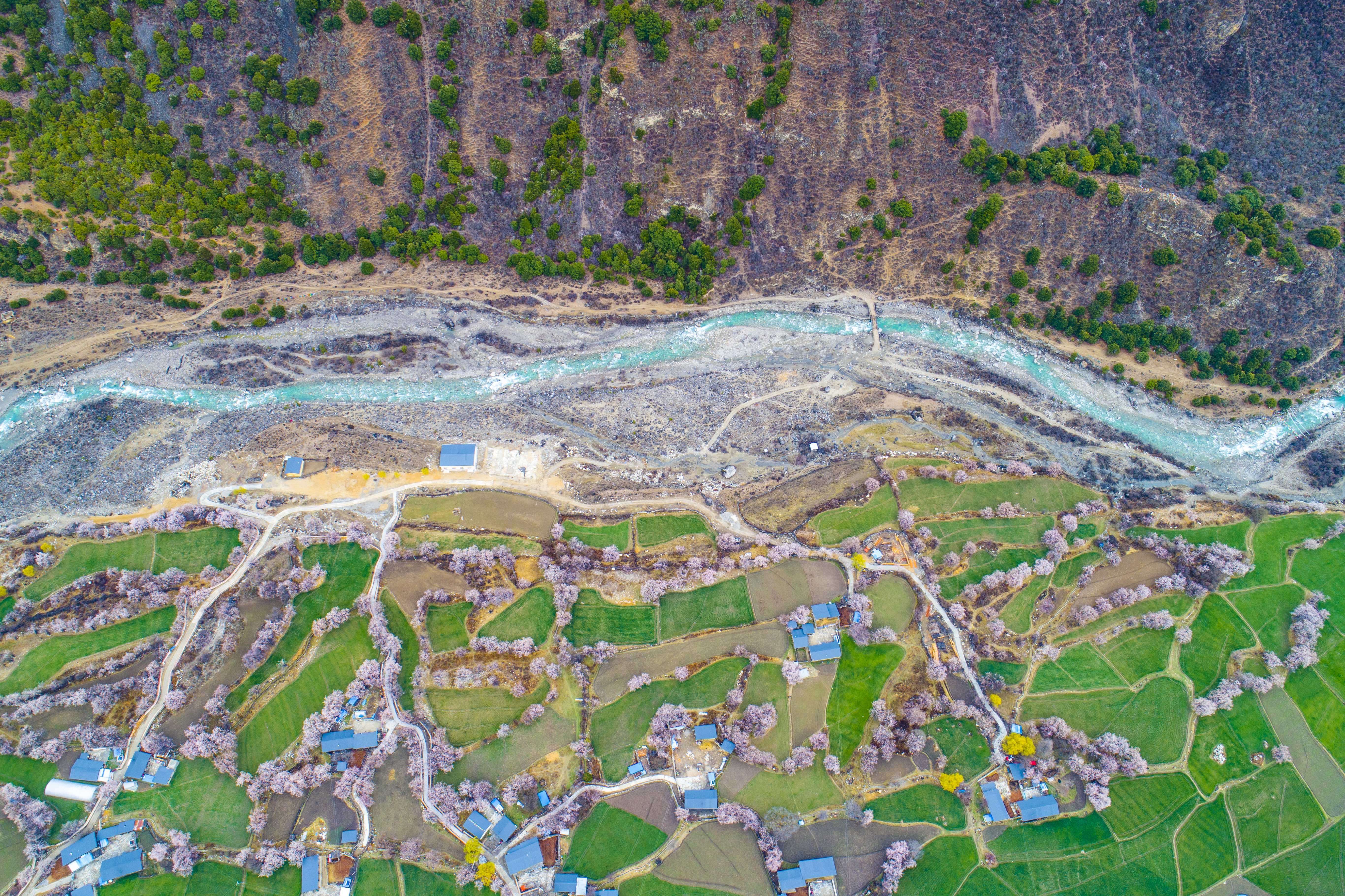 當春風拂過這片神奇的土地,林芝的桃花便如潮水般綻放。漫山遍野,粉色和綠色相間,仿佛是天邊落下的云霞,將整個大地裝點得如夢如幻。