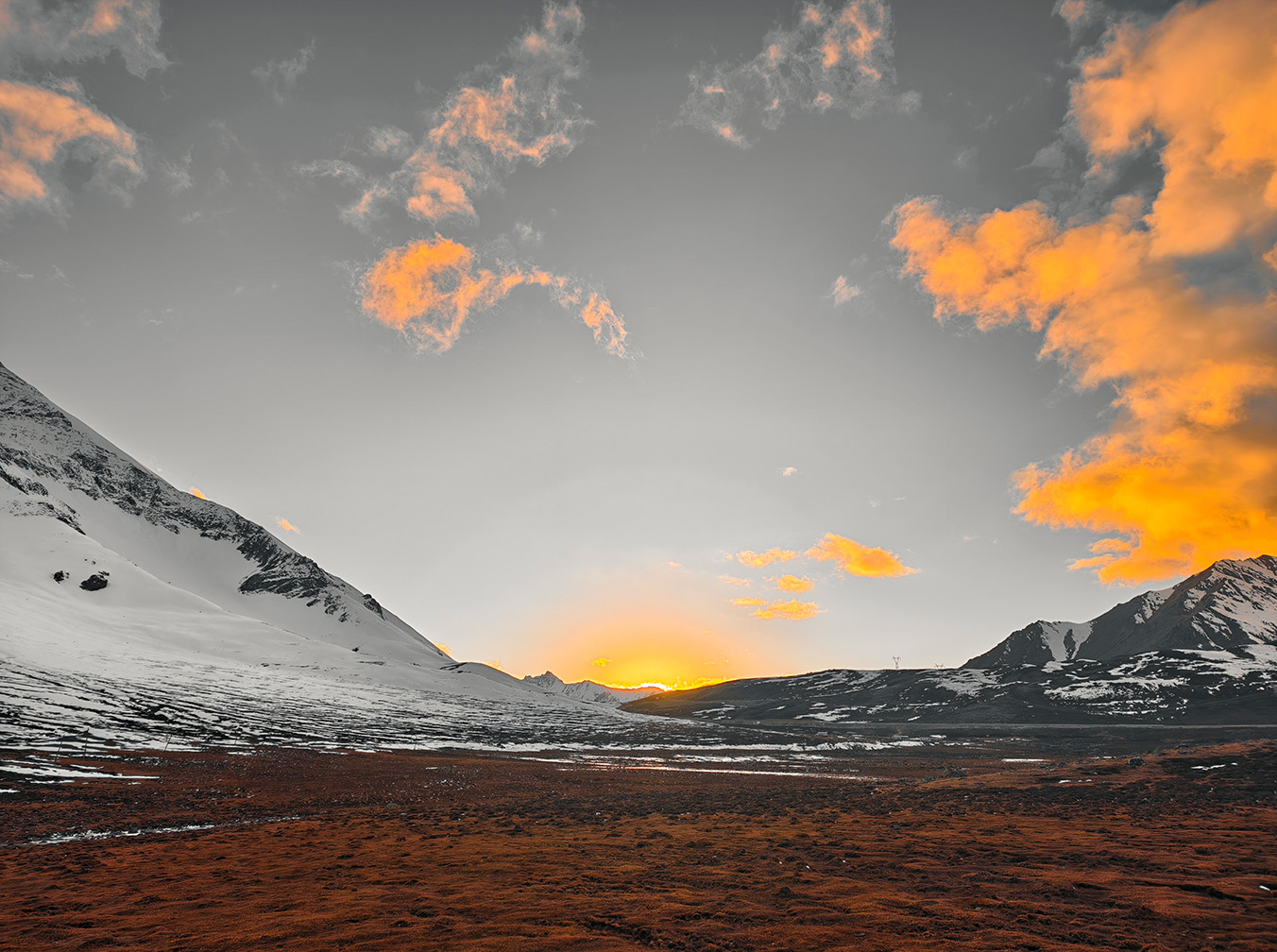 當第一縷朝陽的光芒灑在德姆拉山的雪山上,整個世界仿佛瞬間被點亮。雪山在朝陽的映照下,閃耀著璀璨奪目的光芒,每一片雪花都像是被賦予了生命,跳躍著金色的音符。金色的光輝與潔白的雪相互交融,勾勒出一幅震撼心靈的畫卷。