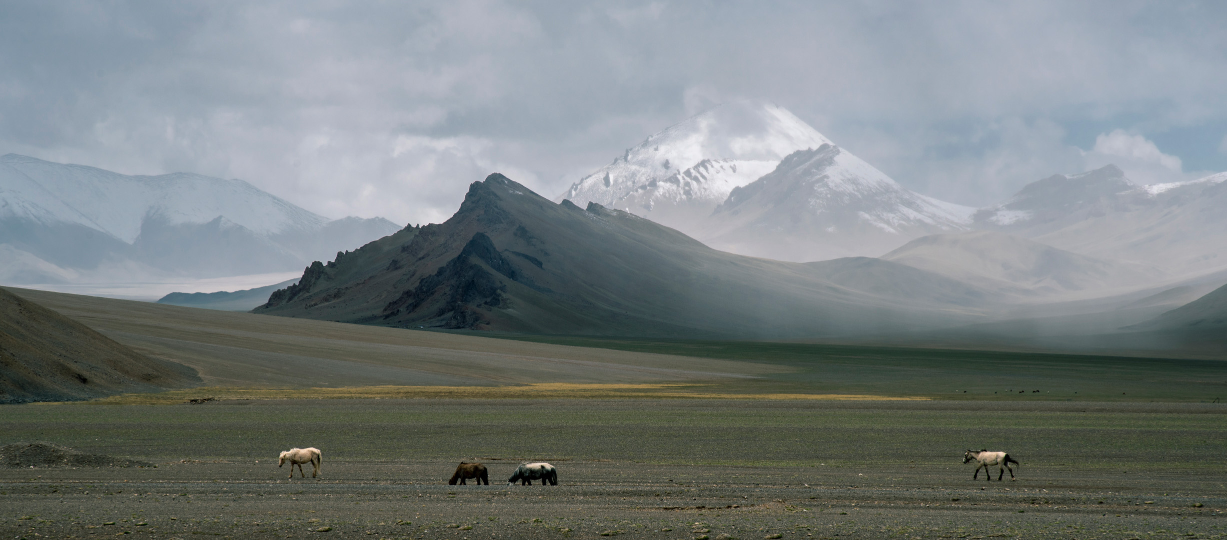 在那廣袤無垠的天地之間,雪山巍峨聳立。雪山腳下,是連綿不斷的草地,仿佛一塊巨大的綠色絨毯,一直鋪展到視線的盡頭,幾只駿馬時而低頭吃草,時而閑適漫步,為這幅如畫的圖景增添了幾分活潑和浪漫。