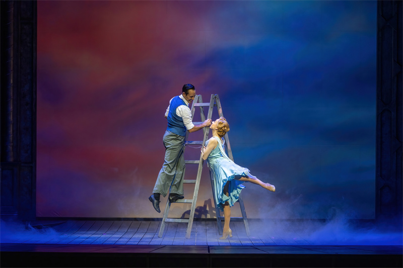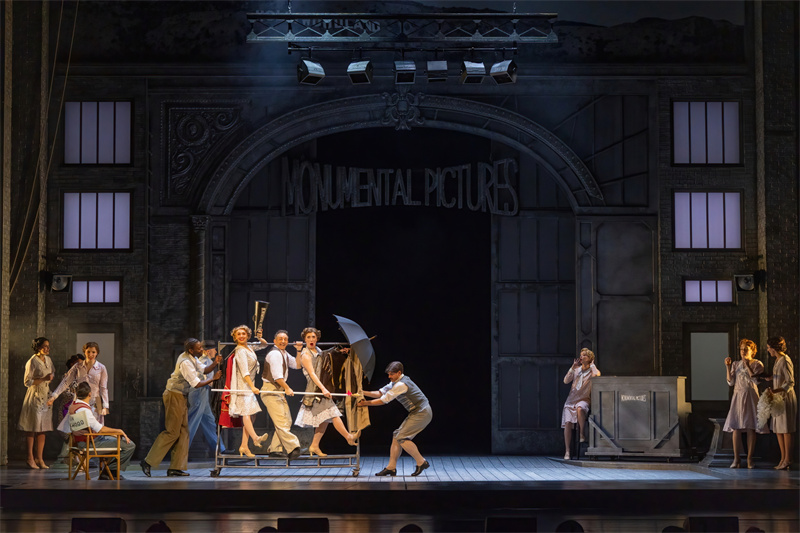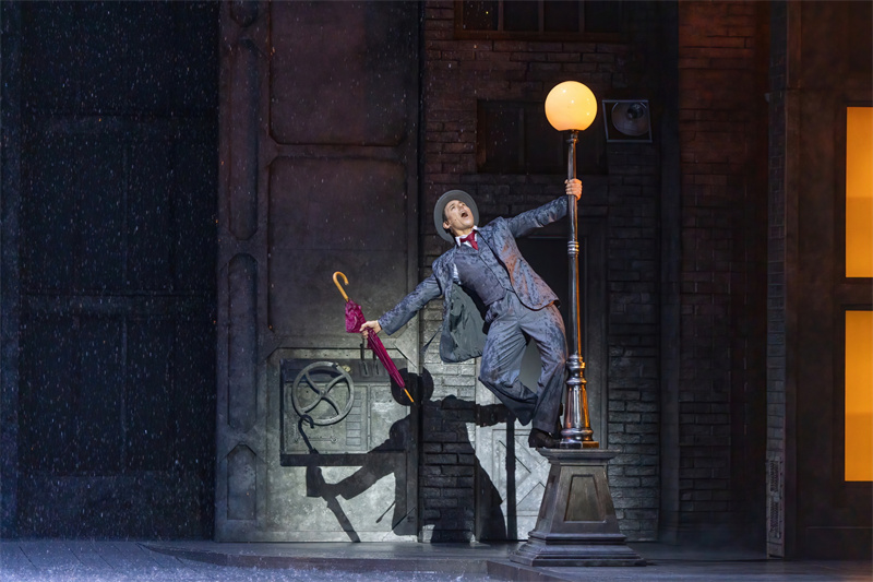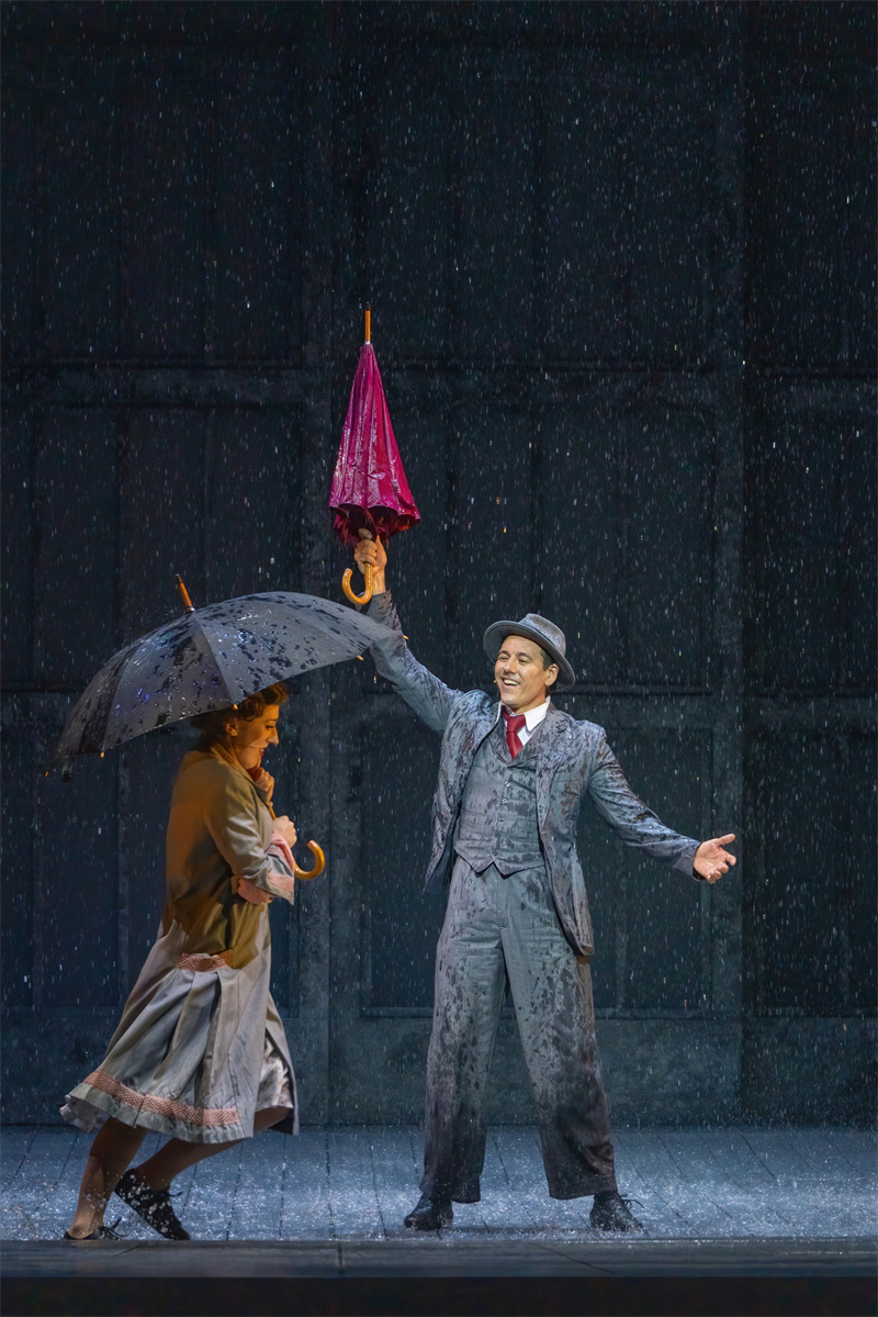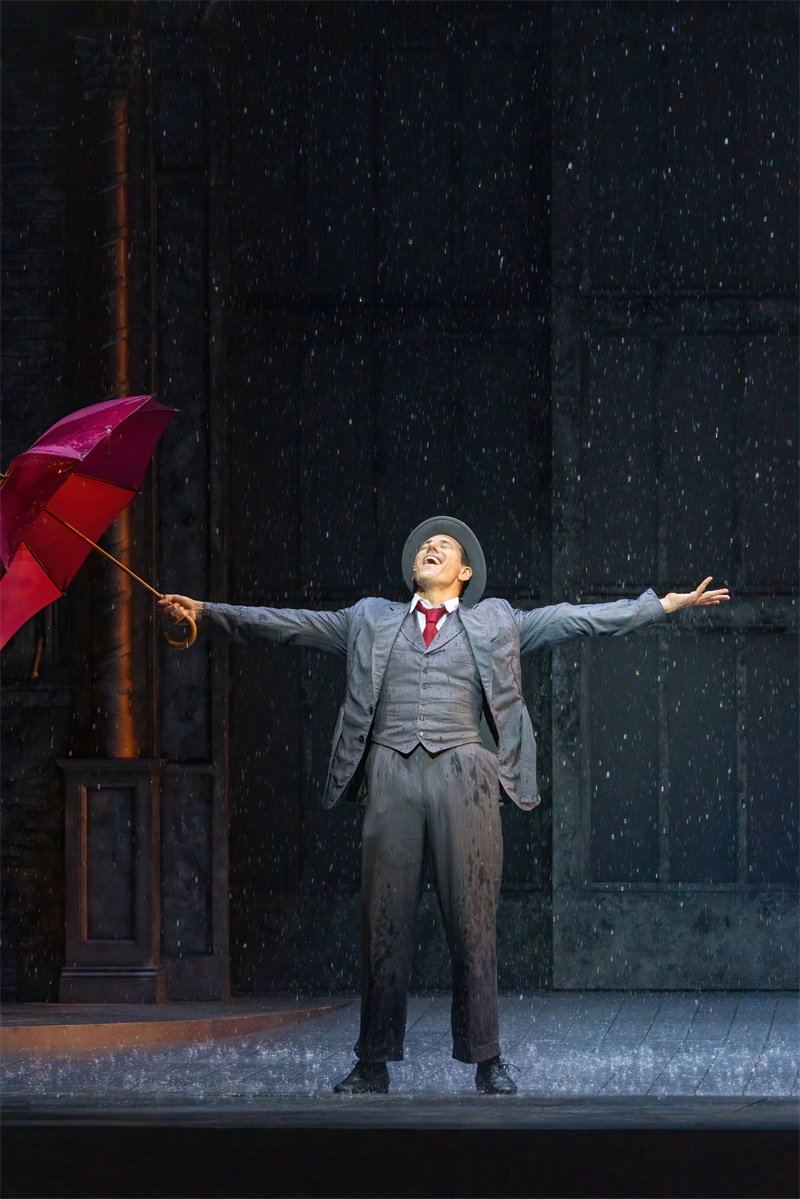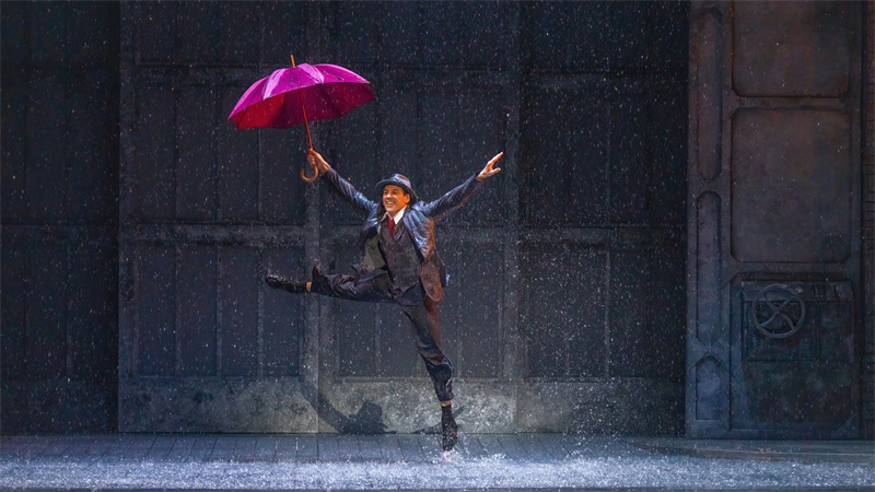 在舞臺上,音樂劇完美還原了電影中的經典唱段,包括《早安》(Good Morning)、《逗他們笑》(Make‘em Laugh)、《摩西假設》(Moses Supposes)和傳唱度極高的曲目《雨中曲》(Singin’in the Rain)。特別是《雨中曲》段落,六噸水傾瀉而下,通過高科技噴淋設備,在舞臺上打造出獨一無二震撼雨幕,格蘭特·阿米拉爾在雨中打著傘歡唱,復刻電影中的名場面,再現一代人兒時關于“雨中曲”的經典回憶?!队曛星泛铣h節更是將現場氣氛推向了高潮,水花飛濺,觀眾隨著音樂的節奏共同歡唱,氣氛熱烈,成為整部音樂劇的亮點之一。