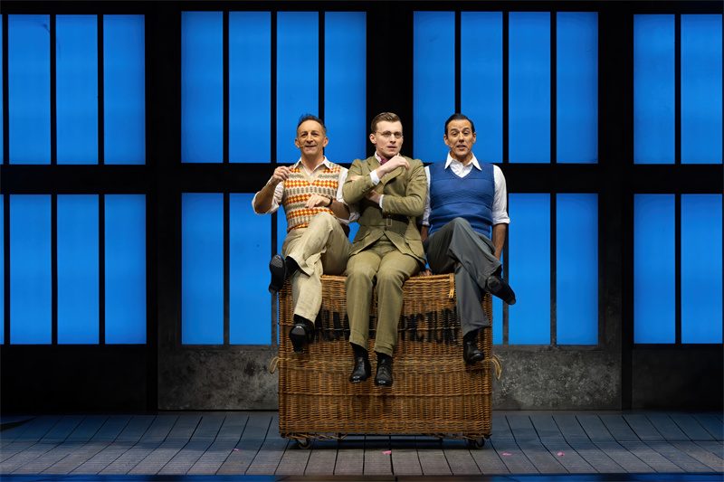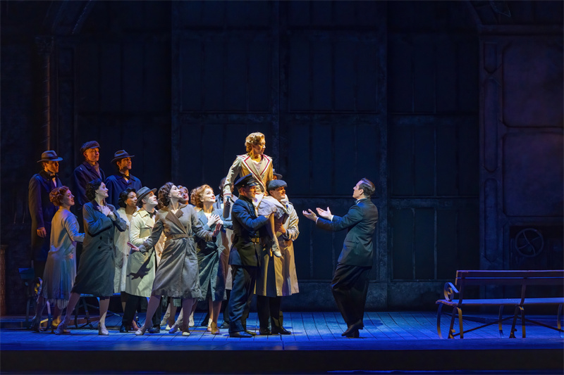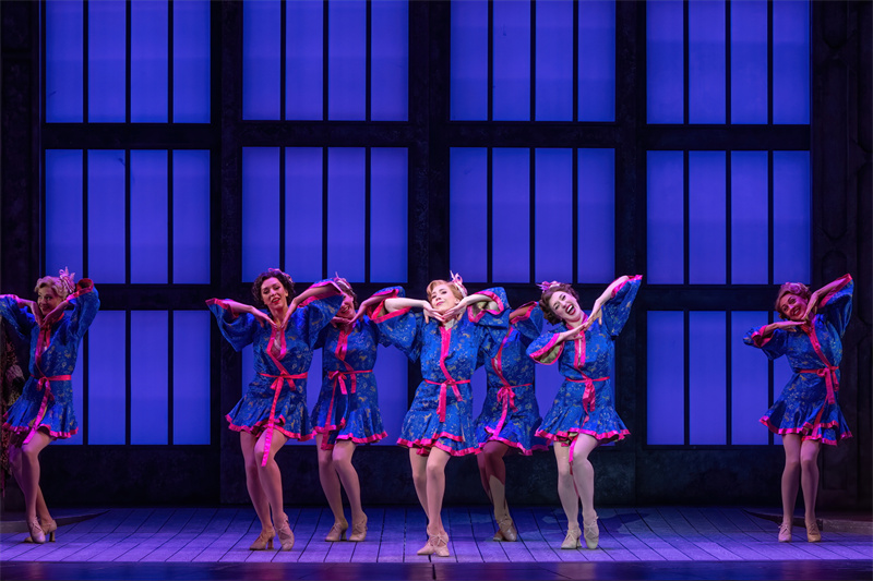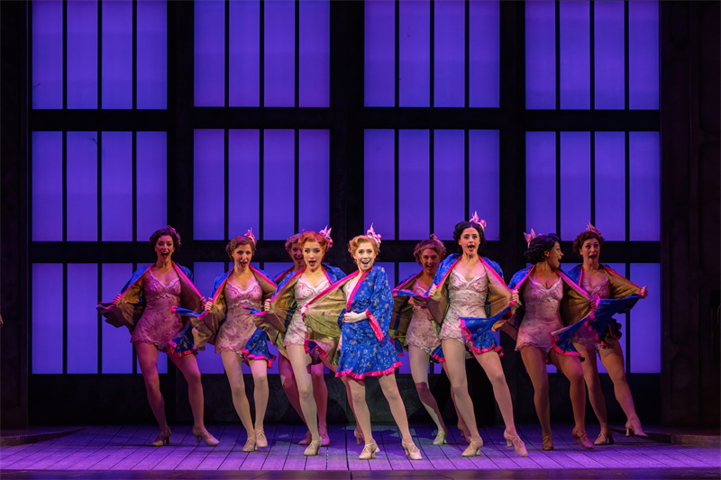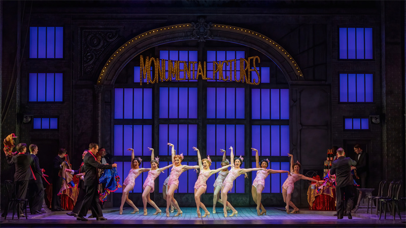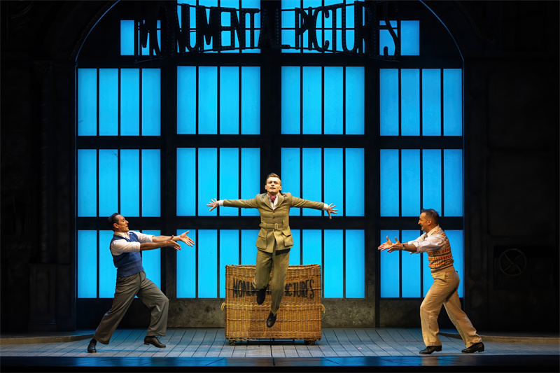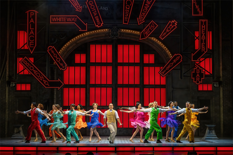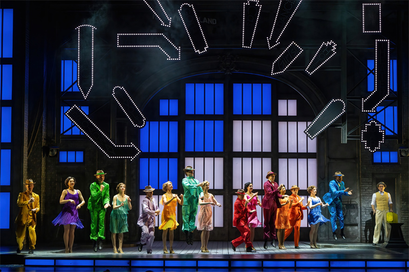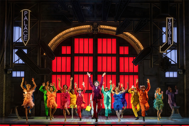 在舞臺上,音樂劇完美還原了電影中的經典唱段,包括《早安》(Good Morning)、《逗他們笑》(Make‘em Laugh)、《摩西假設》(Moses Supposes)和傳唱度極高的曲目《雨中曲》(Singin’in the Rain)。特別是《雨中曲》段落,六噸水傾瀉而下,通過高科技噴淋設備,在舞臺上打造出獨一無二震撼雨幕,格蘭特·阿米拉爾在雨中打著傘歡唱,復刻電影中的名場面,再現一代人兒時關于“雨中曲”的經典回憶?!队曛星泛铣h節更是將現場氣氛推向了高潮,水花飛濺,觀眾隨著音樂的節奏共同歡唱,氣氛熱烈,成為整部音樂劇的亮點之一。