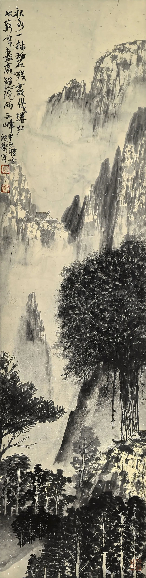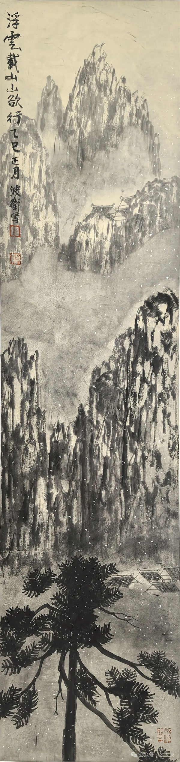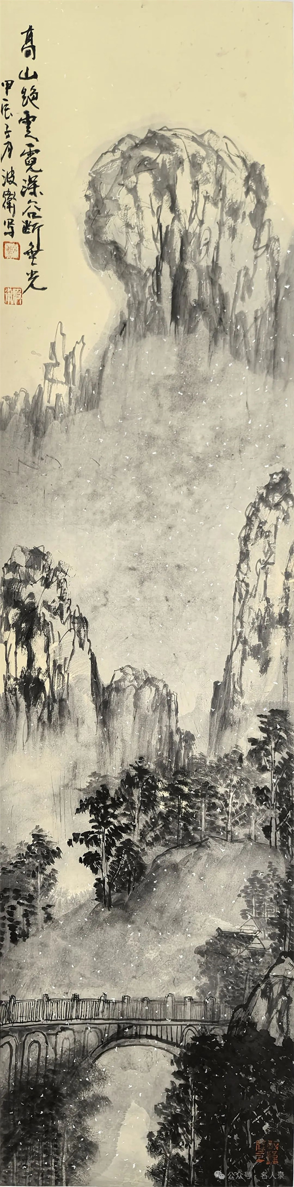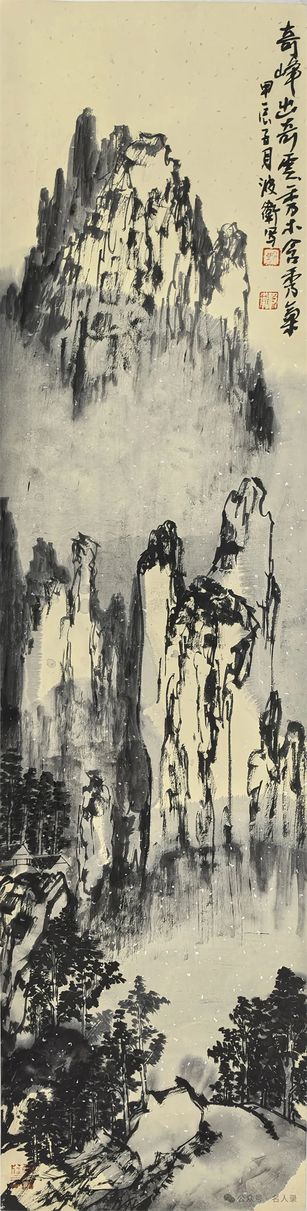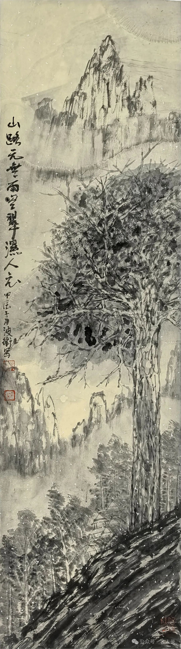 其山水畫作品也具有獨特的藝術風格。他的畫作在山水潑墨間率性奔放,峰如驚濤,松壓巨浪,能讓觀者沉浸其中。他的作品巧妙地借鑒并融入了各類藝術精華,初看時給人新穎大氣磅礴之感,深入觀賞后,又能感受到其在水墨中蘊含的道法自然、天人合一的哲學境界。