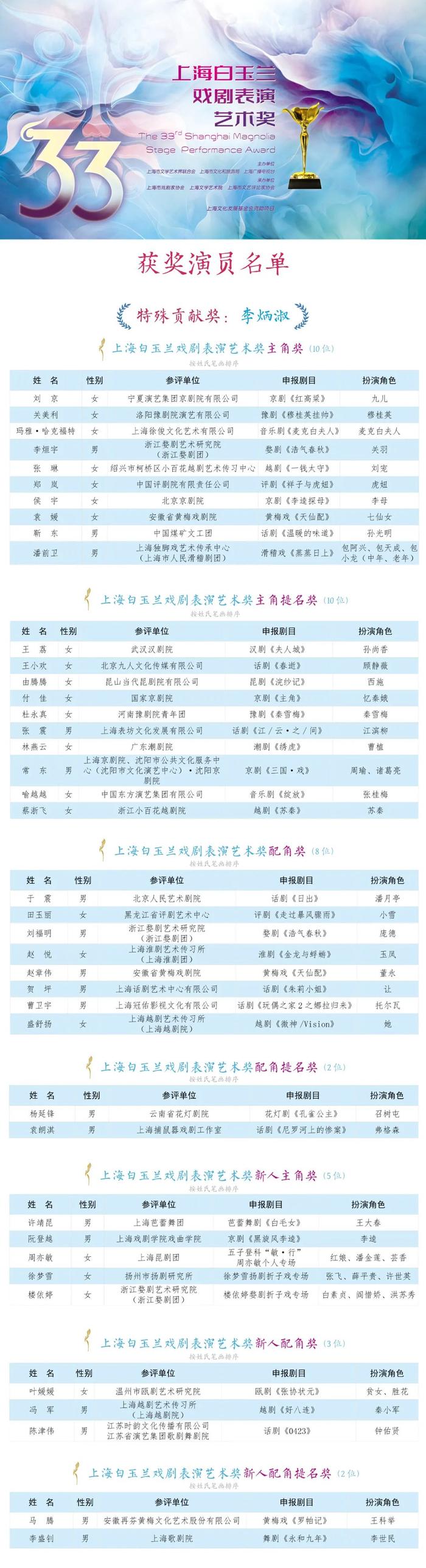 附:第33屆上海白玉蘭戲劇表演藝術獎 獲獎演員名單