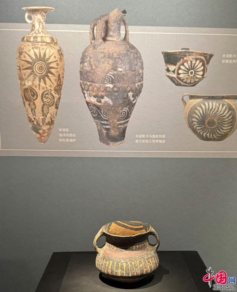 彩陶線條紋雙系罐 新石器時代馬家窯文化 (約公元前3000~前2200年) 故宮博物院藏 展品上方為對應的同時期古希臘文物 攝影 中國網記者 蘇向東