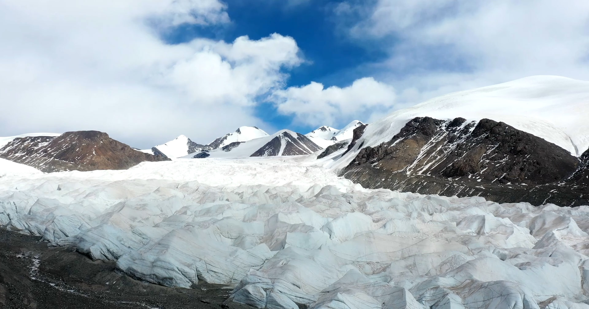 這張圖片展現了格拉丹東冰川的壯麗景象。遠處的雪山巍峨聳立,覆蓋著厚厚的積雪,與澄澈的藍天相接。近處的冰川褶皺如凝固的波濤,潔白的冰面在陽光下泛著微光,云層翻涌其間,增添了幾分神秘與寧靜。整個畫面既有雄渾的氣勢,又不失純凈之美,仿佛大自然的鬼斧神工。
