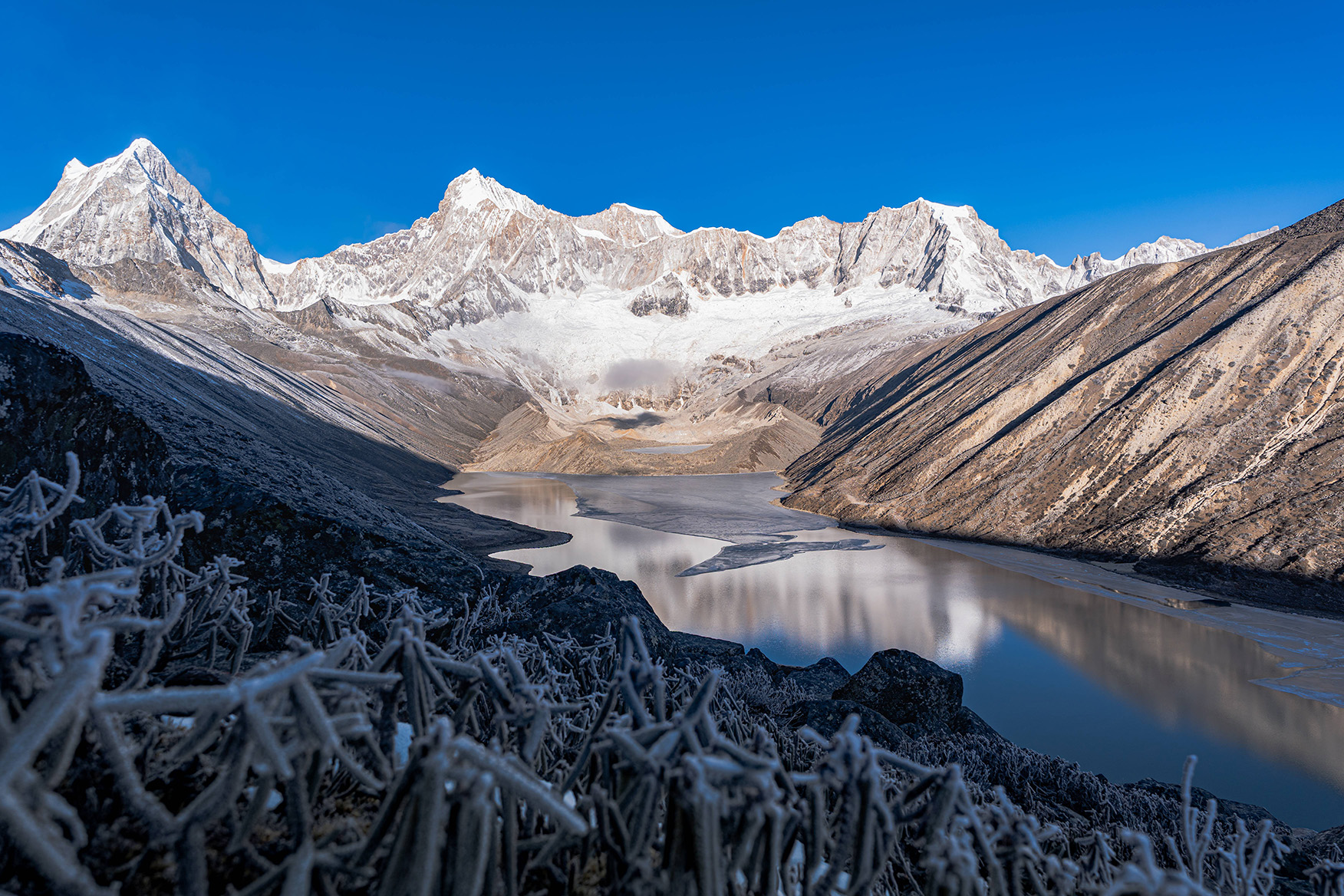 庫拉崗日的壯美盡收眼底,雪山巍峨聳立,湖水如鏡倒映著雪山的倒影,天地間仿佛凝固了時間。山巒起伏,山川褶皺如大地的脈絡,訴說著歲月的滄桑。這幅畫卷將自然的雄渾與寧靜完美融合,令人心馳神往。