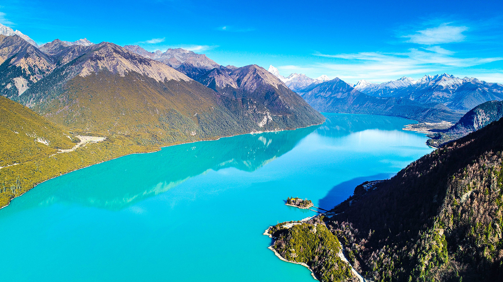 從空中俯瞰巴松措,宛如一顆遺落人間的藍寶石。湛藍的湖水在群山環繞間靜靜鋪展,周邊的雪山像是忠誠的衛士,山頂的積雪在陽光下閃耀,倒映在湖中,與湖底的幽深交織。湖中的小島如同綠色的明珠,島上的植被郁郁蔥蔥,像是大自然精心雕琢的盆景,在這一片澄澈的湖面上,書寫著屬于巴松措的寧靜畫卷。