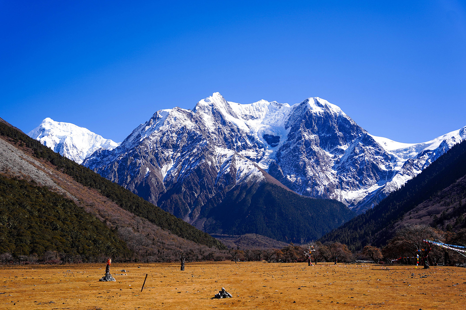 梅里雪山西坡甲應村的高山草甸在秋陽浸染下化作流金調色盤,金黃草色與斑斕落葉交織??ㄍ吒癫┓逦《胙┚€在晨光中閃耀圣潔光輝,云霧游走于峰林間時隱時現,光影交錯間恰似神靈以雪山為筆,將牧場作宣紙,勾勒出獨屬于藏地秋日的立體詩行。