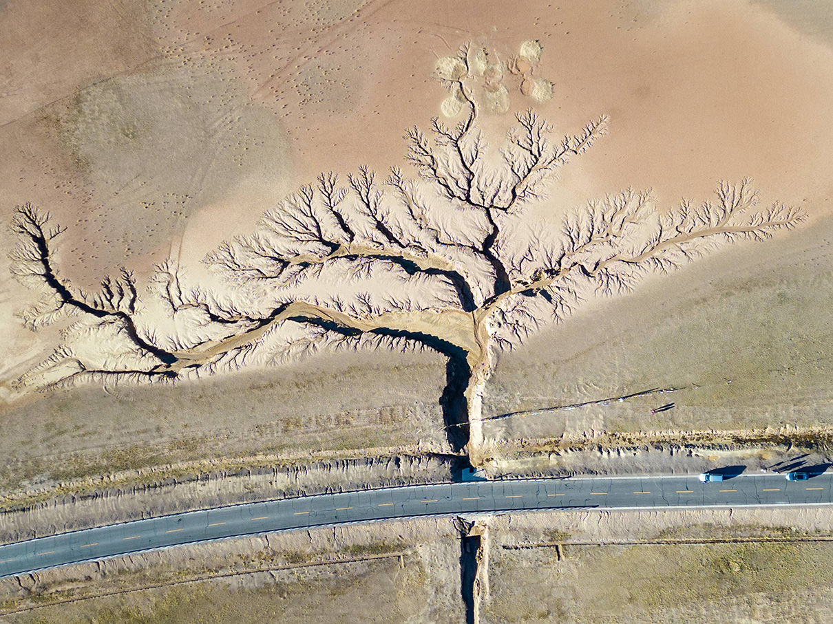 在西藏自治區那曲市尼瑪縣達則措南的荒蕪高原上,從空中俯瞰高原的荒涼之美,干涸河床的紋理如大地之樹,枝干分明延伸至國道317線旁。公路橫貫荒原,干裂的河床仿佛凝固的時間,訴說著高原的生命印記。