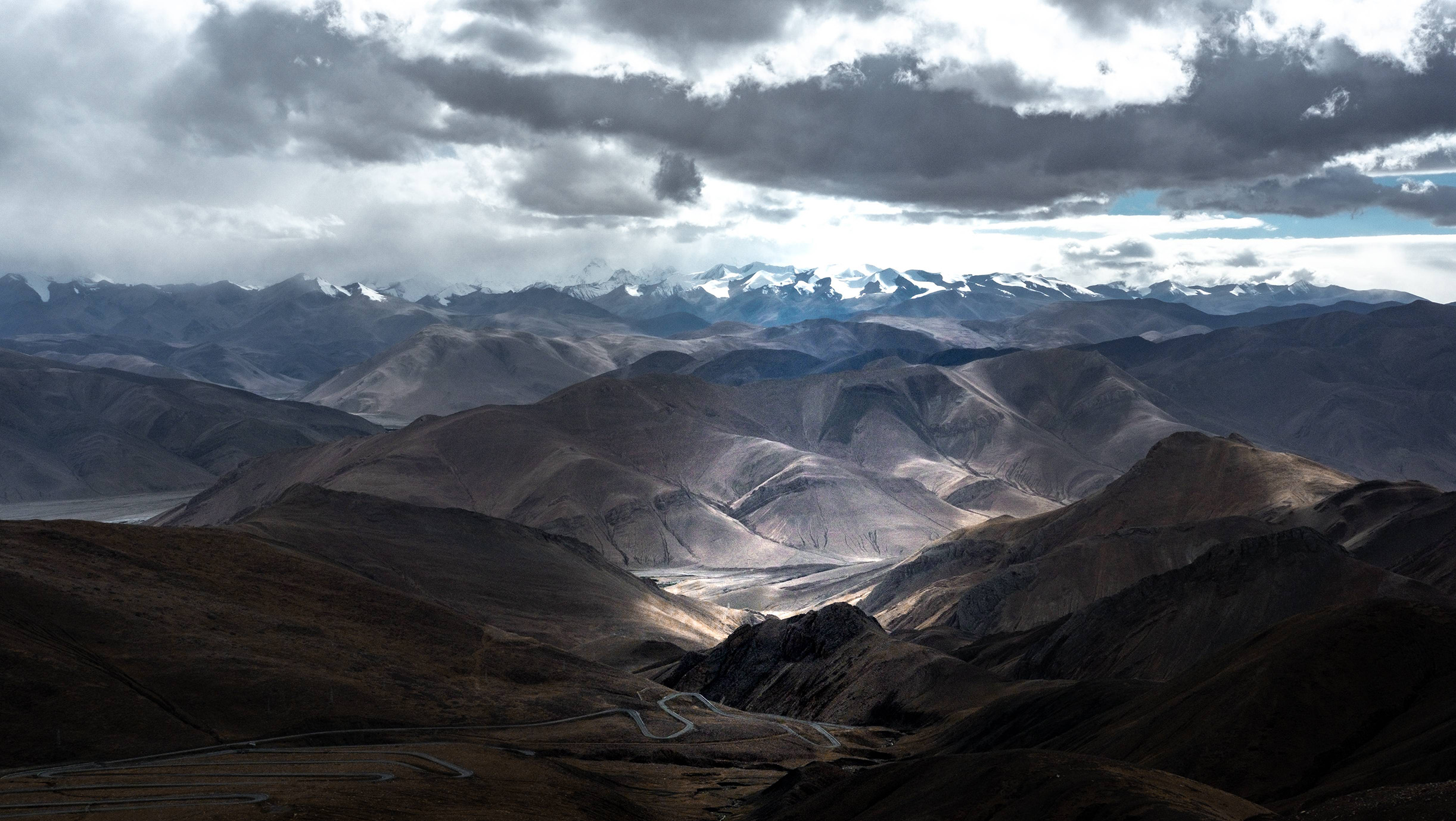 照片拍攝于去珠峰大本營路上的觀景臺,展現了連綿起伏的山脈和蜿蜒的公路。遠處的雪山在云層中若隱若現,給人一種神秘而壯麗的感覺。整個畫面色調偏暗,突出了高原的荒涼與雄渾,讓人感受到大自然的磅礴氣勢和寧靜之美。