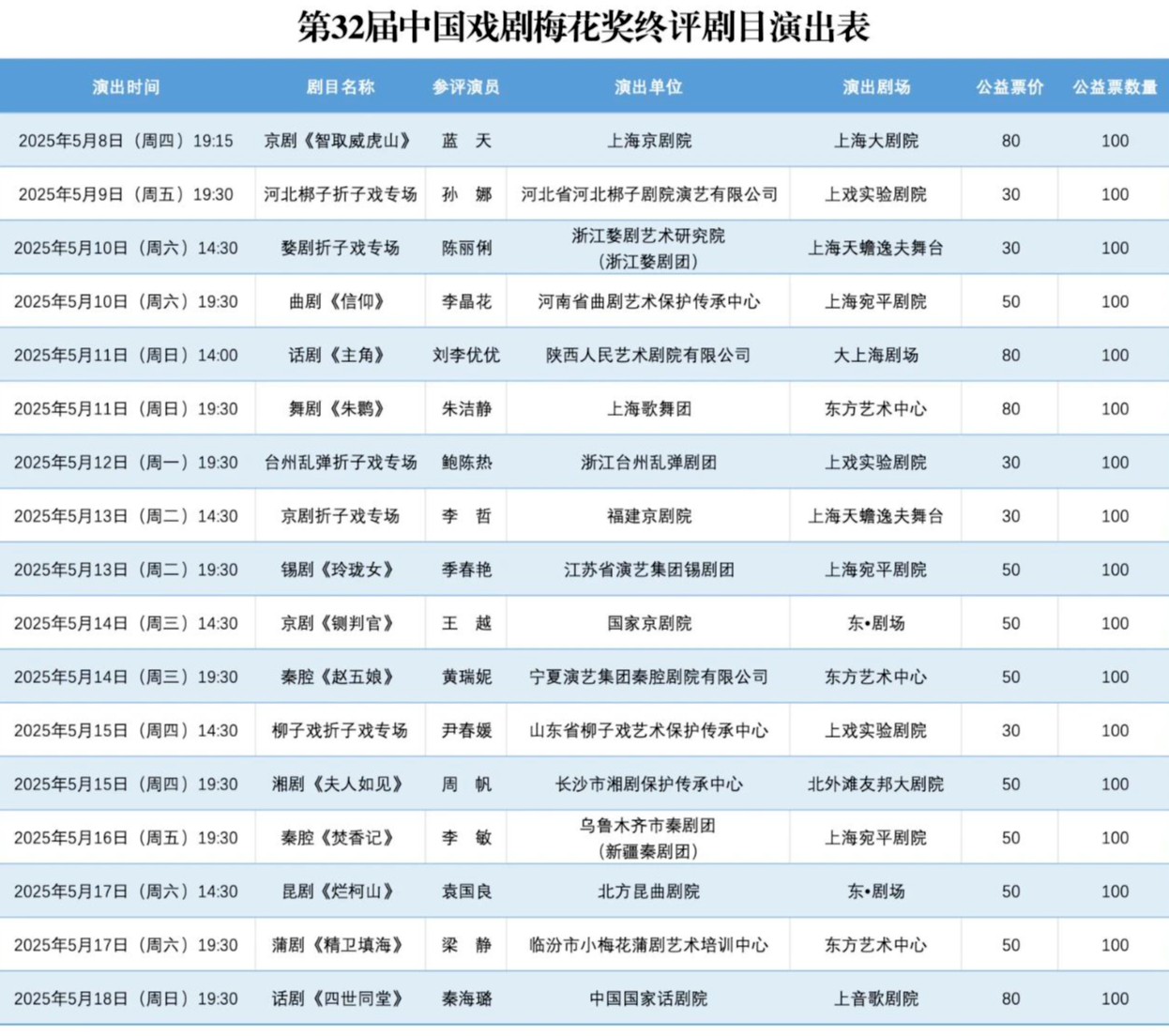 本次梅花獎演出票務將采用市場運營與惠民公益相結合的方式,各場次公益票計劃于2025年4月26日10:00統一開售,票價30元至80元不等,每場100張??蓲呙栉哪┒S碼進入梅花獎終評劇目購票小程序,進入各劇院購票系統購買。