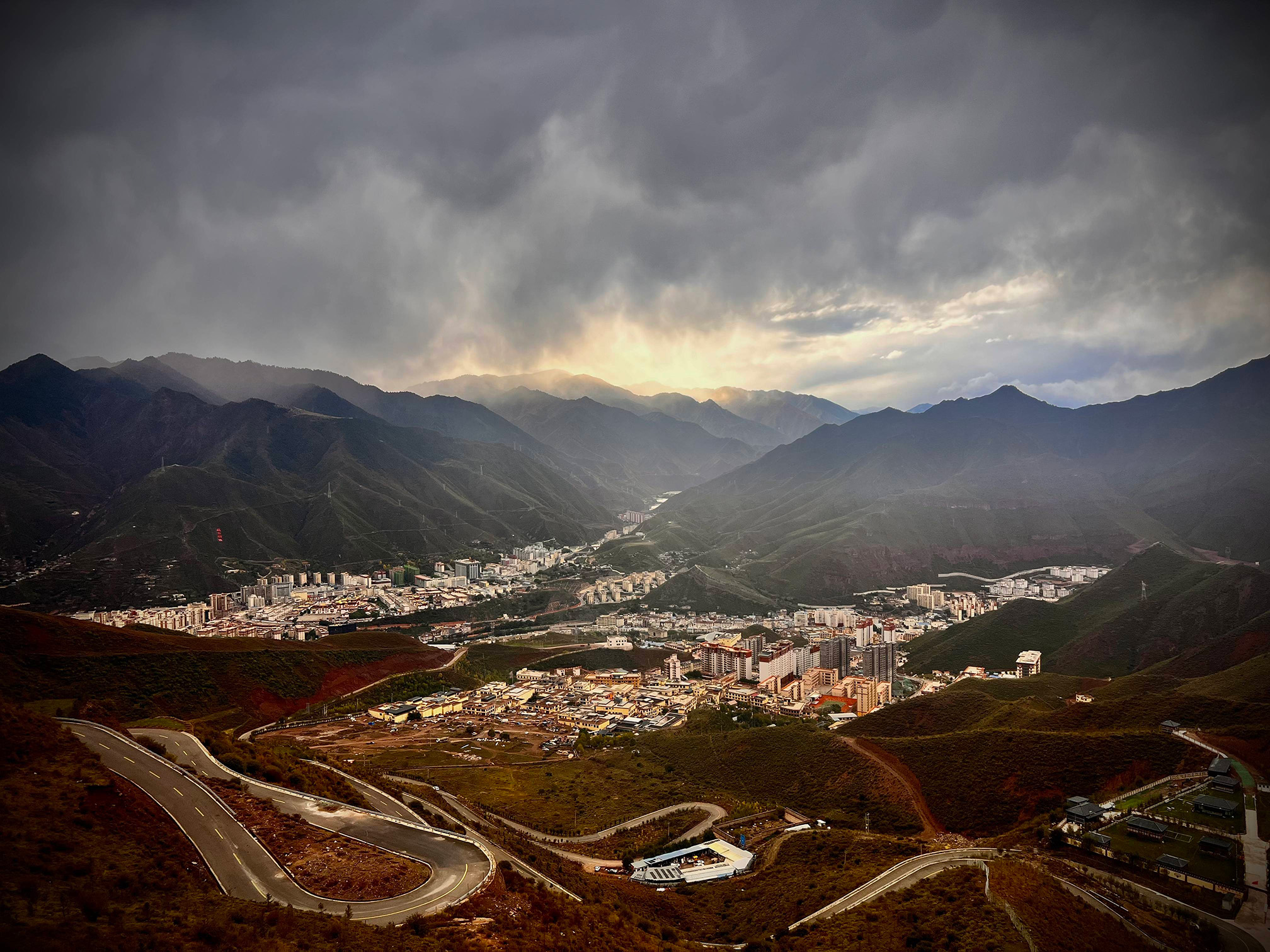 傍晚,站在達瑪拉山埡口處俯瞰昌都市,一幅壯麗景致映入眼簾。天空中,滿天烏云滾滾而來,似一塊巨大的幕布。天邊那一縷落日余暉卻穿透烏云的縫隙,奮力傾灑光芒。暖橙色的余暉灑在昌都市的“身上”,為這座城市勾勒出金色輪廓。