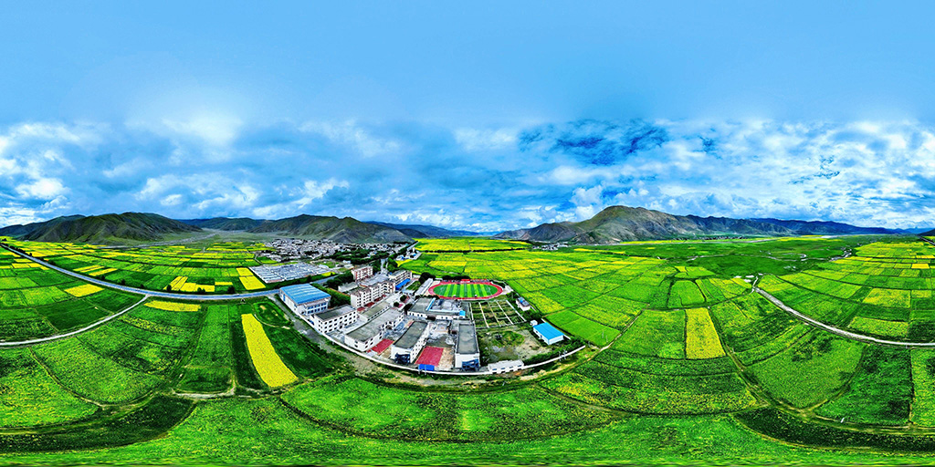 西藏自治區堅持將生態惠民、生態利民、生態富民,把改善民生和凝聚人心作為生態環境保護工作的出發點和落腳點,積極推動鄉村生態改善,建設美麗宜居鄉村。房屋、農田與遠處的群山、湛藍的天空構成一幅美麗和諧的畫卷。