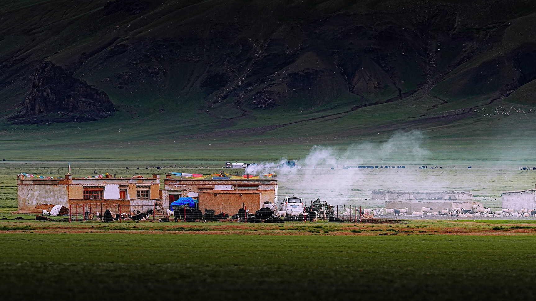 遼闊草原和廣袤起伏的山巒連為一體,展現出羌塘草原的綠意盎然和無邊無際。房屋、裊裊升起的炊煙、圍欄里的牦牛和羊群,為草原增添了更多生活場景,體現了羌塘草原上牧民質樸和悠閑的生活狀態。