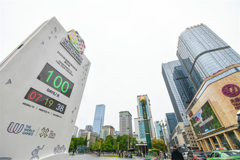 4月29日在成都天府廣場拍攝的成都世運會倒計時電子裝置。新華社記者 王曦 攝
