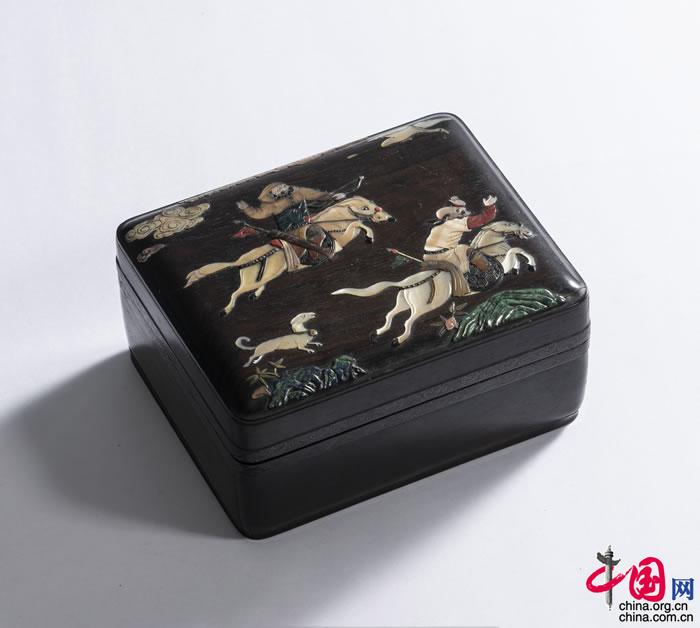 明晚期,紫檀百寶嵌狩獵圖長方盒