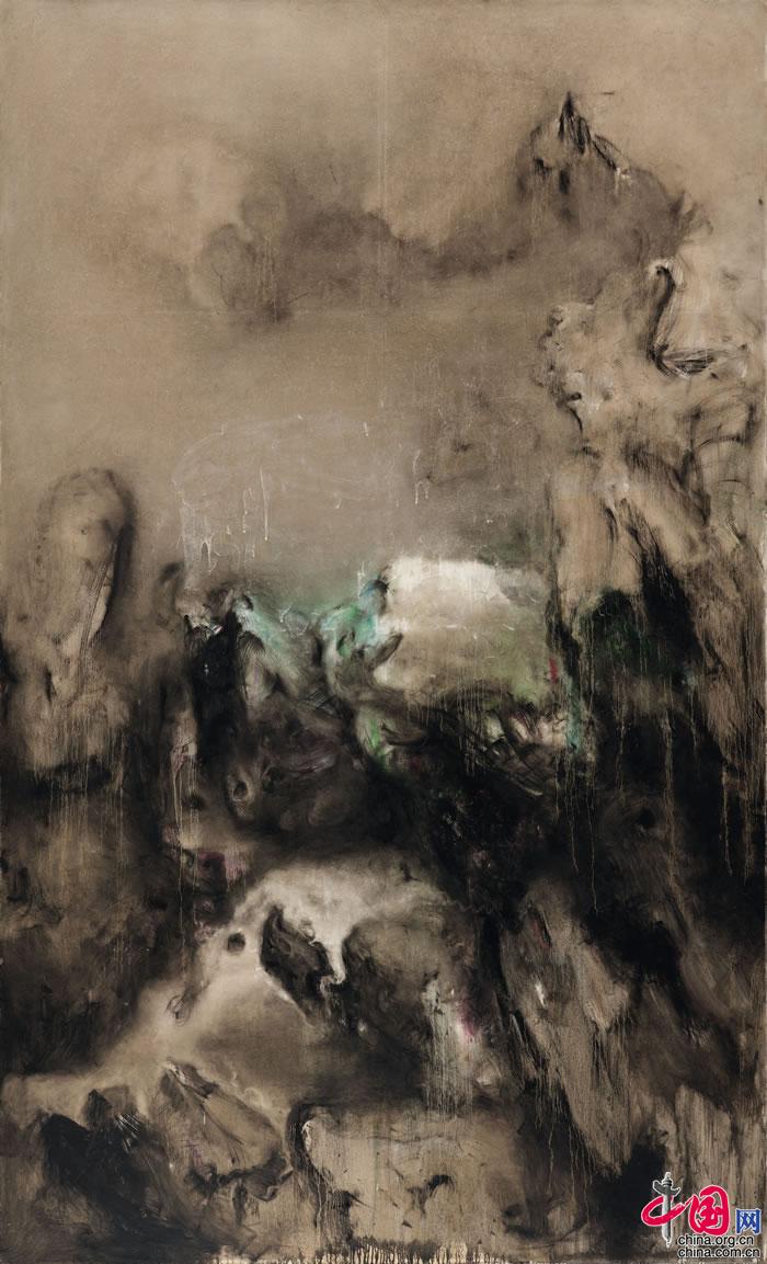 周春芽 山石與煙云,2003年,358.5×220 cm. 布面 油畫