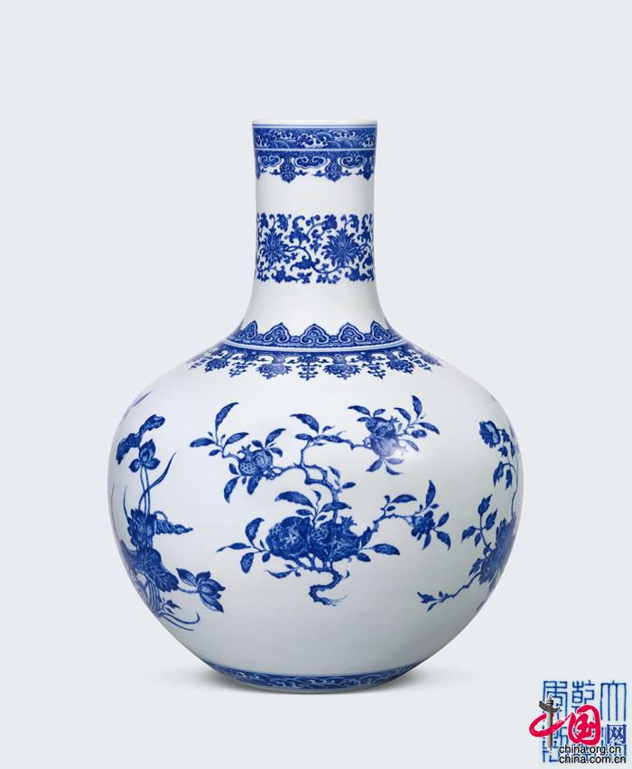 清乾隆,青花折枝花果紋天球瓶,“大清乾隆年制”六字三行篆書款