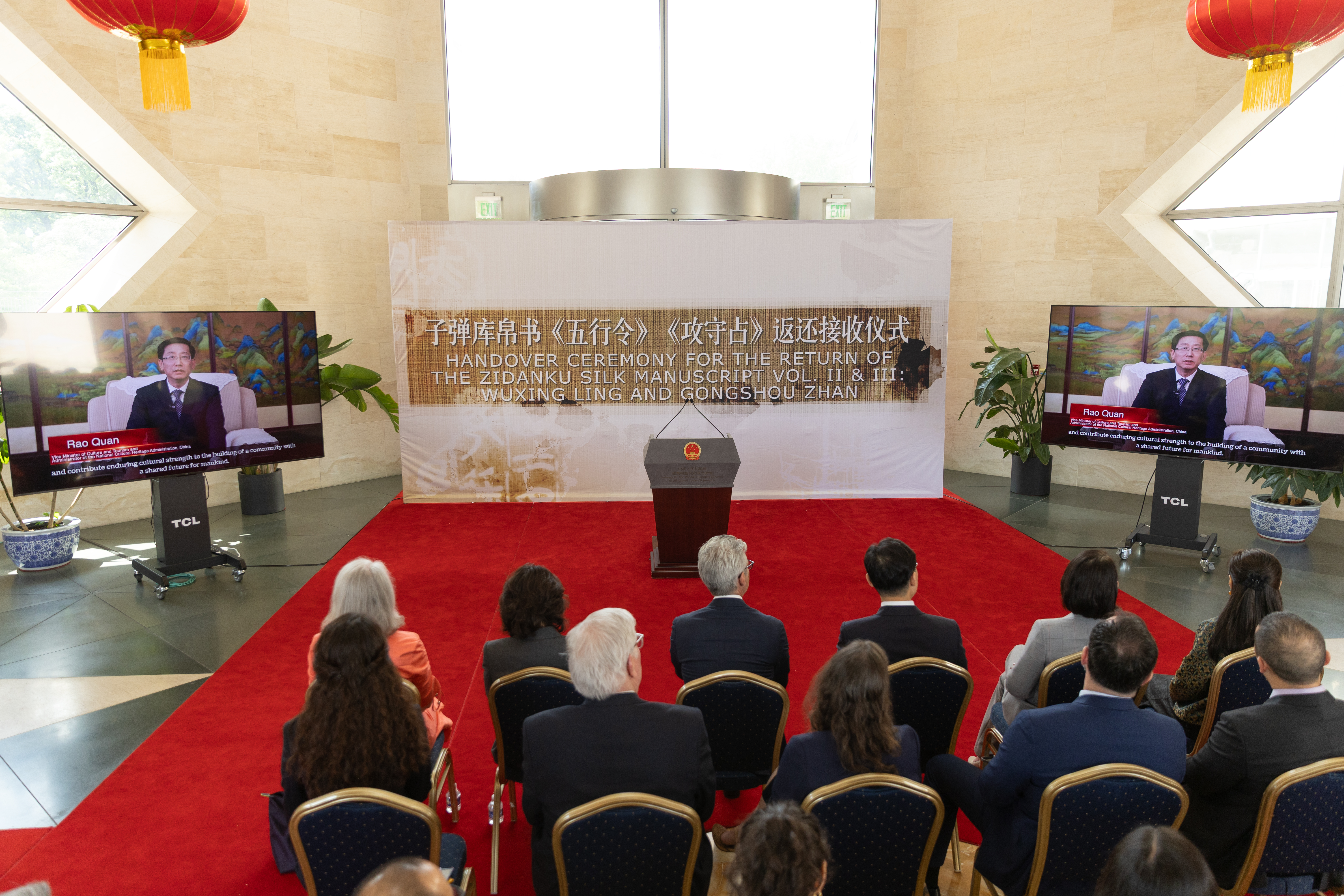 5月16日,子彈庫帛書《五行令》《攻守占》返還接收儀式在中國駐美國使館舉行。圖為文化和旅游部副部長、國家文物局局長饒權發表視頻致辭。