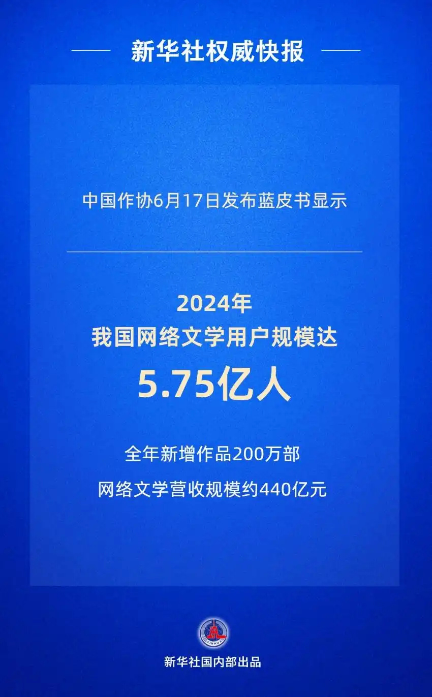 中國作家協會6月17日發布的《2024中國網絡文學藍皮書》顯示,我國網絡文學用戶規模達5.75億人。核心閱讀群體為26至45歲讀者,約占全部讀者的50%;“00后”讀者占比近25%。