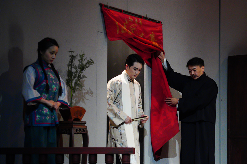 在吳祖光的這部經典劇作中,每一個角色都鮮活而立體,沒有絕對的主次之分,每個人物都在故事的脈絡中熠熠生輝。演出當晚,每一位演員都全情投入,用真摯的表演詮釋了各自的角色,令人動容又回味無窮。飾演王新貴、徐輔成的是國家大劇院戲劇演員隊演員董汶亮與孫立石,他們將圍繞在魏蓮生身邊的、出身市井底層的人物演繹得入木三分,更將梨園后臺與尋常人家的自在、平實展現出來,構成了吳祖光筆下的人物全景。當尾聲悠揚的的音樂響起,身著一襲紅衣的余少群,輕執一把折扇,在雪夜中踏歌起舞。就在這一片白茫茫之中,一代名伶的人生大戲悄然落下帷幕,似夢如幻,余韻悠長。整部劇的美學意蘊令在場觀眾沉浸其中,正是“劇終魂還在,曲終人不散”。