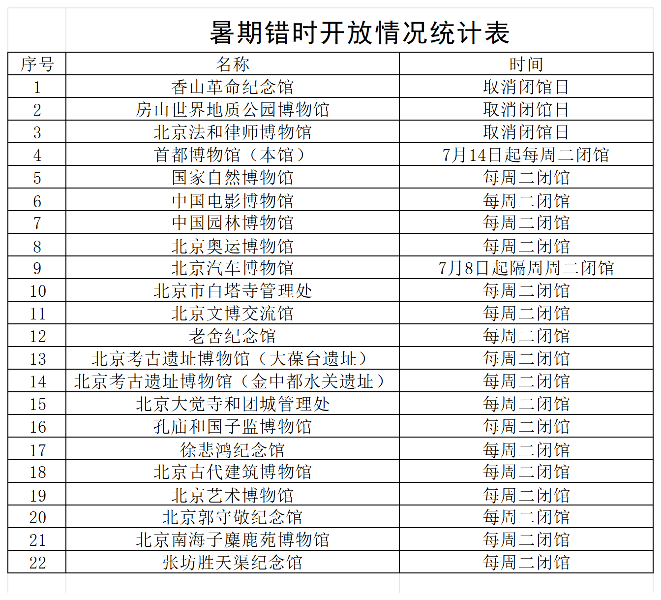 北京汽車博物館、團城演武廳、北京考古遺址博物館、北京市白塔寺管理處、北京郭守敬紀念館、北京文博交流館等多博物館將閉館日由周一調整為周二,同時延長開放時間。香山革命紀念館、房山世界地質公園博物館、北京法和律師博物館暑期取消閉館日。