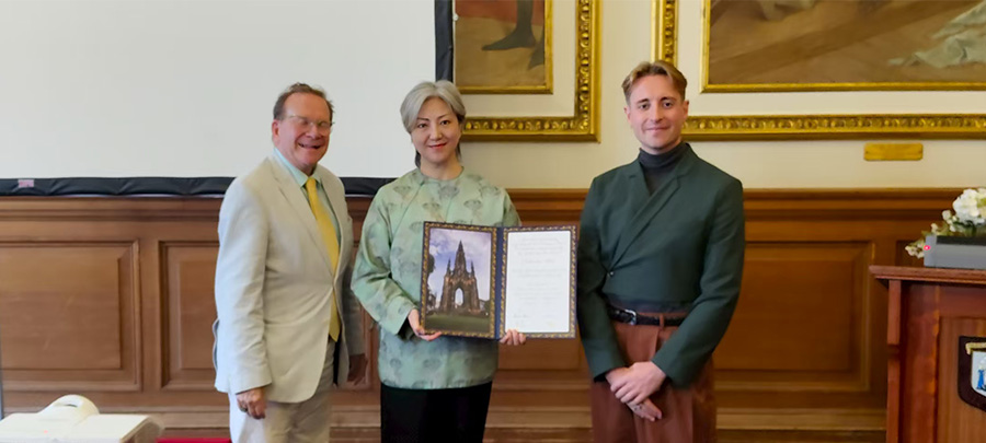 當地時間8月7日,在愛丁堡會議廳歐洲廳舉辦的昆曲全球推廣頒獎典禮上,全球青年連線的王彤、劉小川、于思陽、楊越溪這些青年學者發揮了積極的作用。愛丁堡議會議員Finley Macfarlane代表愛丁堡政府致歡迎辭,盛贊今年的昆曲演出美輪美奐,期待明年的昆曲推廣季如期舉辦,并授予魏春榮首位愛丁堡藝術節“亞洲藝術大使”榮譽稱號。這不僅是魏春榮個人藝術成就的巔峰,更標志著愛丁堡藝術節對中國昆曲藝術的深度認可。楊鳳一致辭時表示,愛丁堡藝術節見證了昆曲從“非遺瑰寶”到“世界語言”的跨越,更堅定了劇院推動昆曲全球傳播、促進文化互鑒的決心與信心。