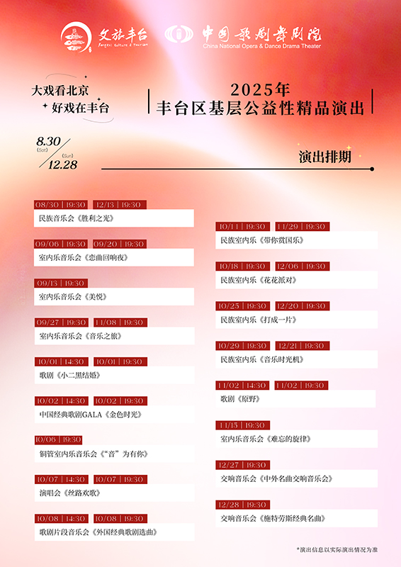 此次公益性精品演出活動由豐臺區文化和旅游局與中國歌劇舞劇院聯合舉辦。中國歌劇舞劇院調集歌劇團、交響樂團、民族樂團三大主力團擔綱演出,匯聚一線精英演員,由長期活躍于國內外舞臺的中青年藝術家領銜,以專業實力為豐臺區觀眾呈現高水準藝術演出。