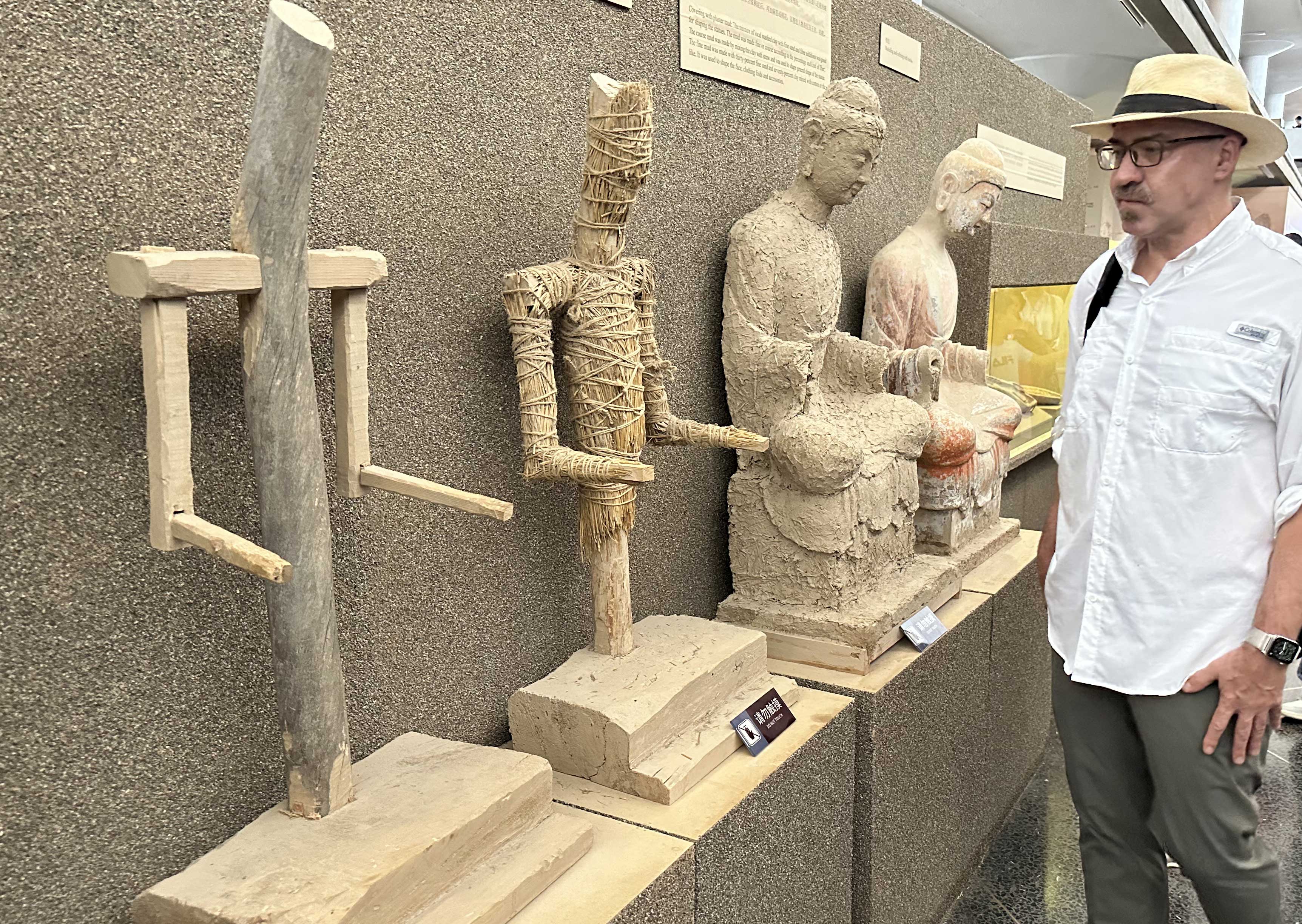 2025年8月8日,史瀚文在敦煌石窟文物保護研究陳列中心研究彩塑的制作過程。中新社記者 馮志軍 攝