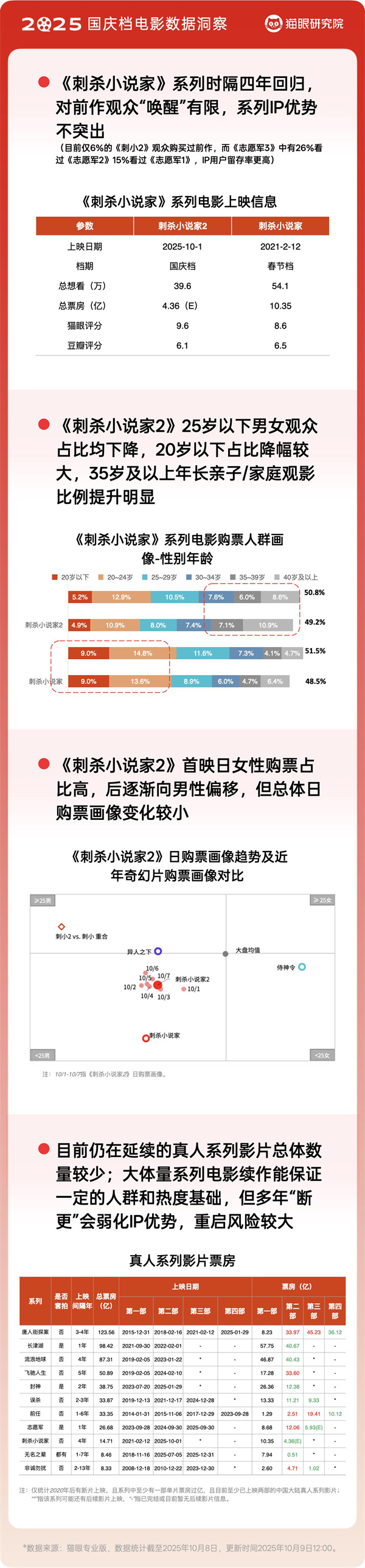 從單片表現來看,由于新片整體熱度一般,檔期內無影片票房破5億。兩部IP續作成今年國慶檔新片票房主力:《志愿軍:浴血和平》以4.50億的檔期票房成績領跑,表現相對穩??;奇幻動作片《刺殺小說家2》檔期內收獲2.95億票房,位列新片第二。從市場反饋來看,大體量系列電影續作能保證一定的人群和熱度基礎,但如果上映間隔時間較長則會削弱IP的系列優勢。如《刺殺小說家2》與前作時隔四年,導致未能大比例喚醒前作觀眾的觀影熱情,IP用戶留存率遠不及“志愿軍”系列。此外,老片中《731》憑借其題材和熱度,檔期內表現堅挺,位居整個國慶檔票房亞軍。