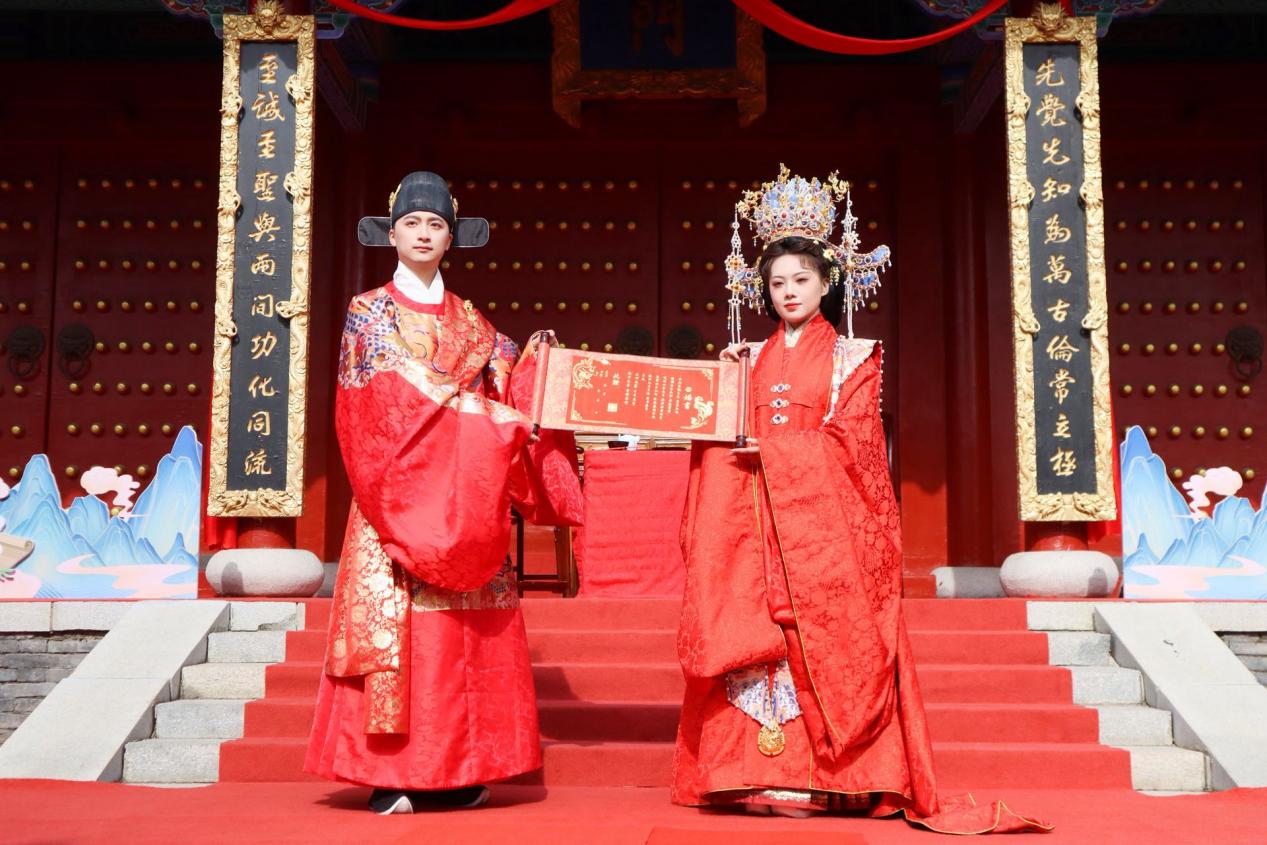 在長春市文廟博物館,明制漢婚展演隆重舉行。新郎新娘身著傳統婚服,依古禮行“奠雁”“拜天地”“合巹同牢”等儀式。鳳冠霞帔華美奪目,圓領袍服端莊大氣,配合古樸的儀仗與禮樂,盡顯明代婚儀的典雅與神圣。儀式后,講解員還對婚服形制與禮儀內涵進行解讀,引導觀眾理解漢服作為禮制載體的深層意義。