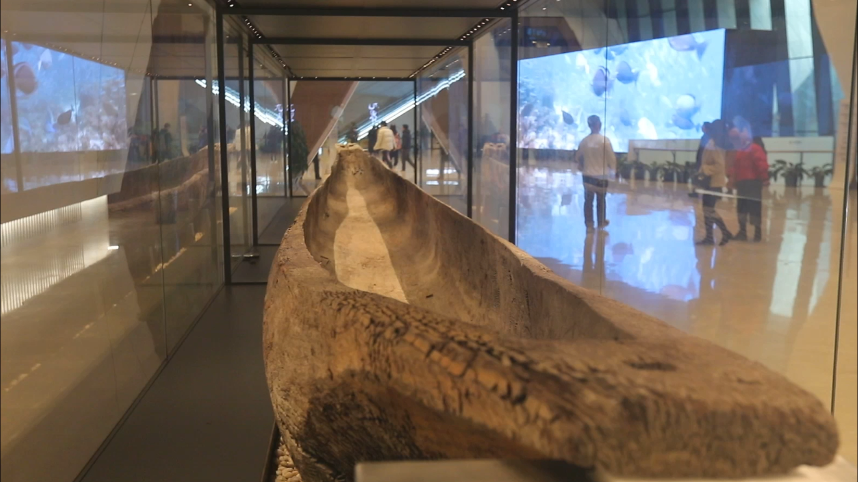展廳中的唐代獨木舟是天津國家海洋博物館“鎮館之寶”之一(央廣網記者 周思楊 攝)